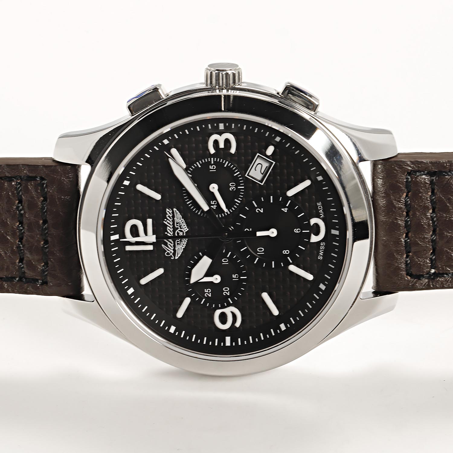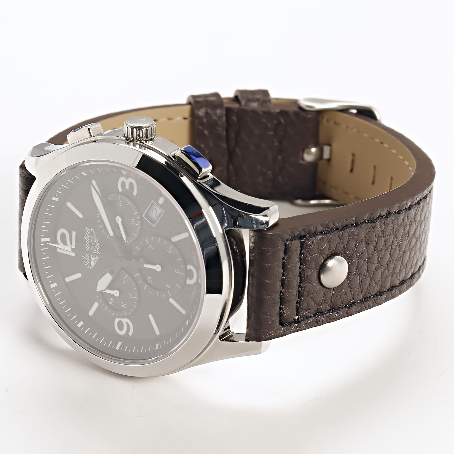 Привлекательные многофункциональные часы для мужчин высокого полета. Функциональные мужские часы Aviation. Часы-хронограф с секундомером. Круглый стальной корпус. Метки в виде штрихов и арабских цифр. Рифленая заводная головка. Кожаный ремешок с классической застежкой.