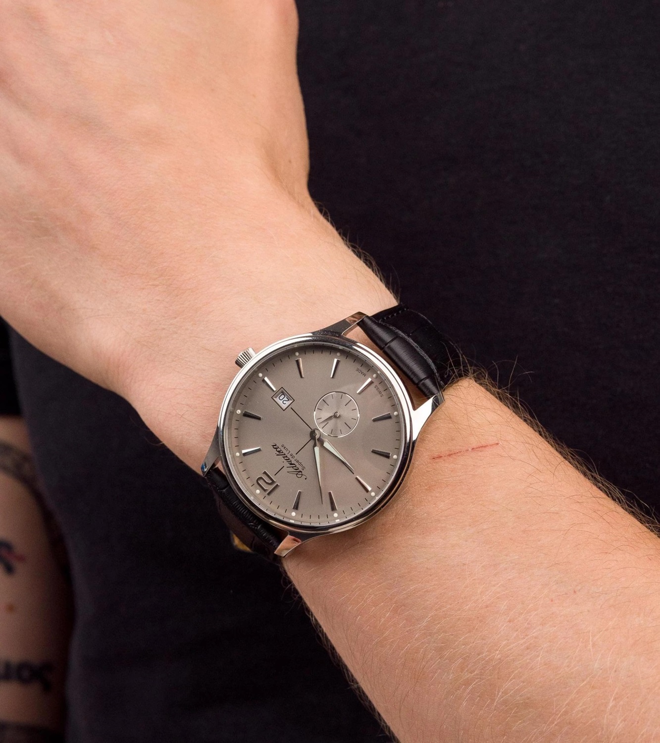 Элегантные часы для успешных мужчин, которые никогда не подведут и покажут точное время. Мужские кварцевые часы в круглом корпусе. Метки в виде штрихов и арабской цифры 12. Окошко даты в положении 3 часа. Секундная стрелка вынесена на малый циферблат. Рифленая заводная головка. Кожаный ремешок.