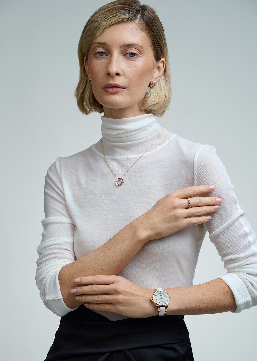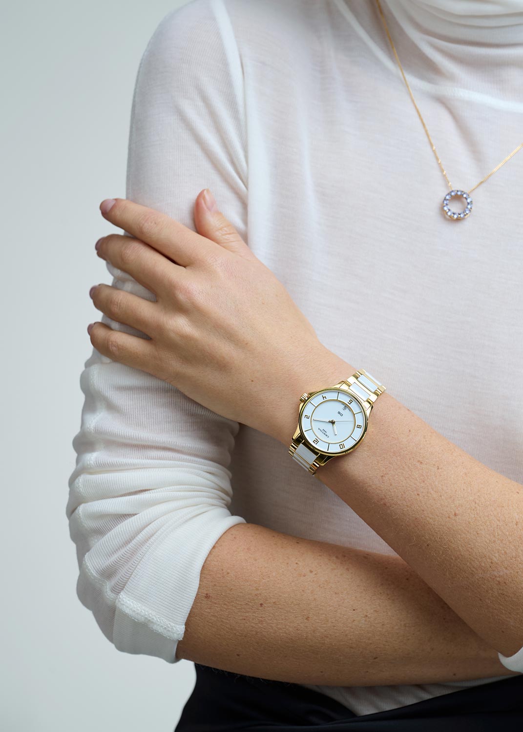 Великолепный стиль и непревзойденное швейцарское качество, эти удобные и надежные часы отлично подойдут для повседневного общения со временем. Кварцевые наручные женские часы. Хронометр. Фирменная технология PreciDrive обеспечивает погрешность не более +/-10 сек в год (в 10 раз точнее обычных кварцевых часов). Функция индикации заряда (EOL). В механизме 3 камня. Круглый стальной корпус. Двухуровневый циферблат. Заостренные прямоугольные стрелки в стиле Baton. Накладные метки в виде штрихов и арабских цифр. Стрелки с люминесцентным покрытием, которое светится в темноте после непродолжительной зарядки на свету. Окошко даты находится в положении 6 часов. Рифленая заводная головка с защитой. Надежный стальной браслет с керамическими вставками и раскладывающейся застежкой.