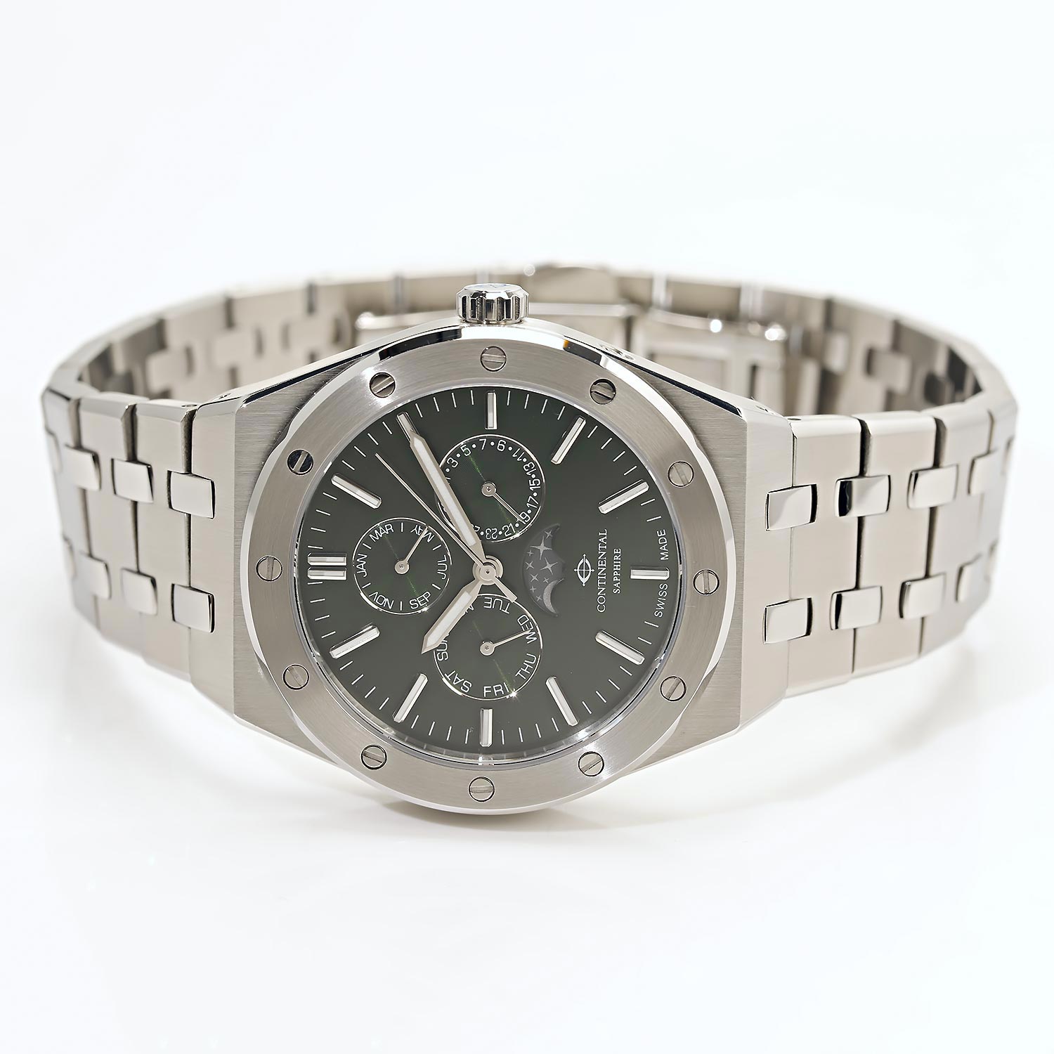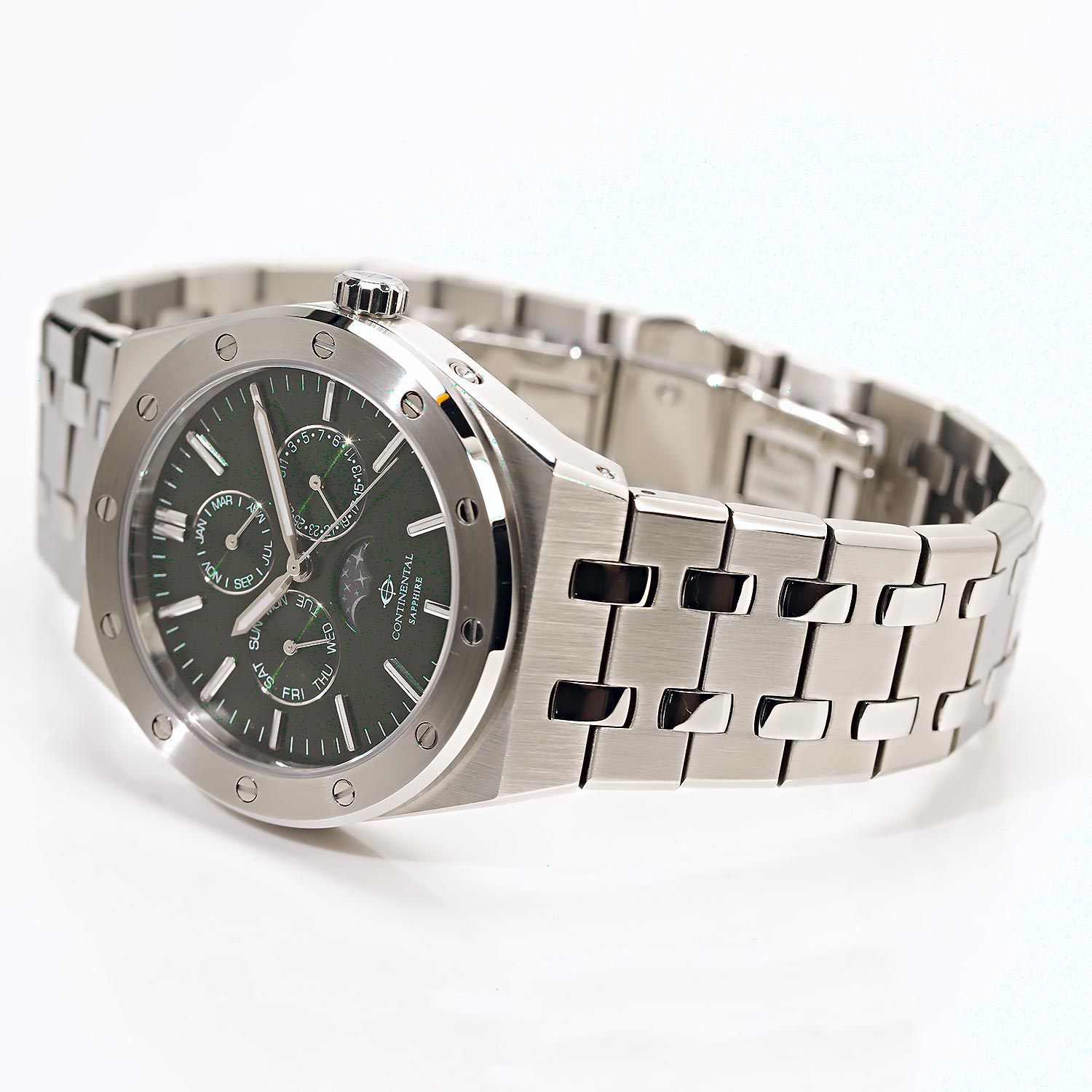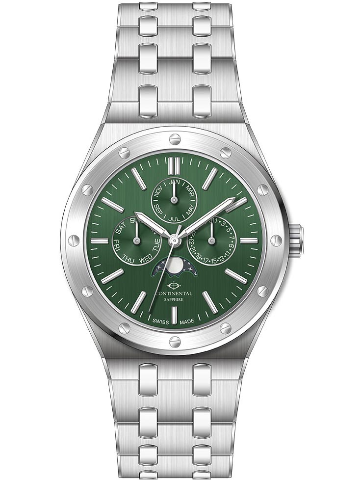 Швейцарские часы Continental созданы для элегантного образа мужчины. Multifunction&Chronograph. Мужские часы. Функция индикации заряда (EOL). Число, день недели и месяц отображаются на отдельных циферблатах. Фаза луны. Метки в виде штрихов. Рифленая заводная головка. Браслет с раскладывающейся застежкой.