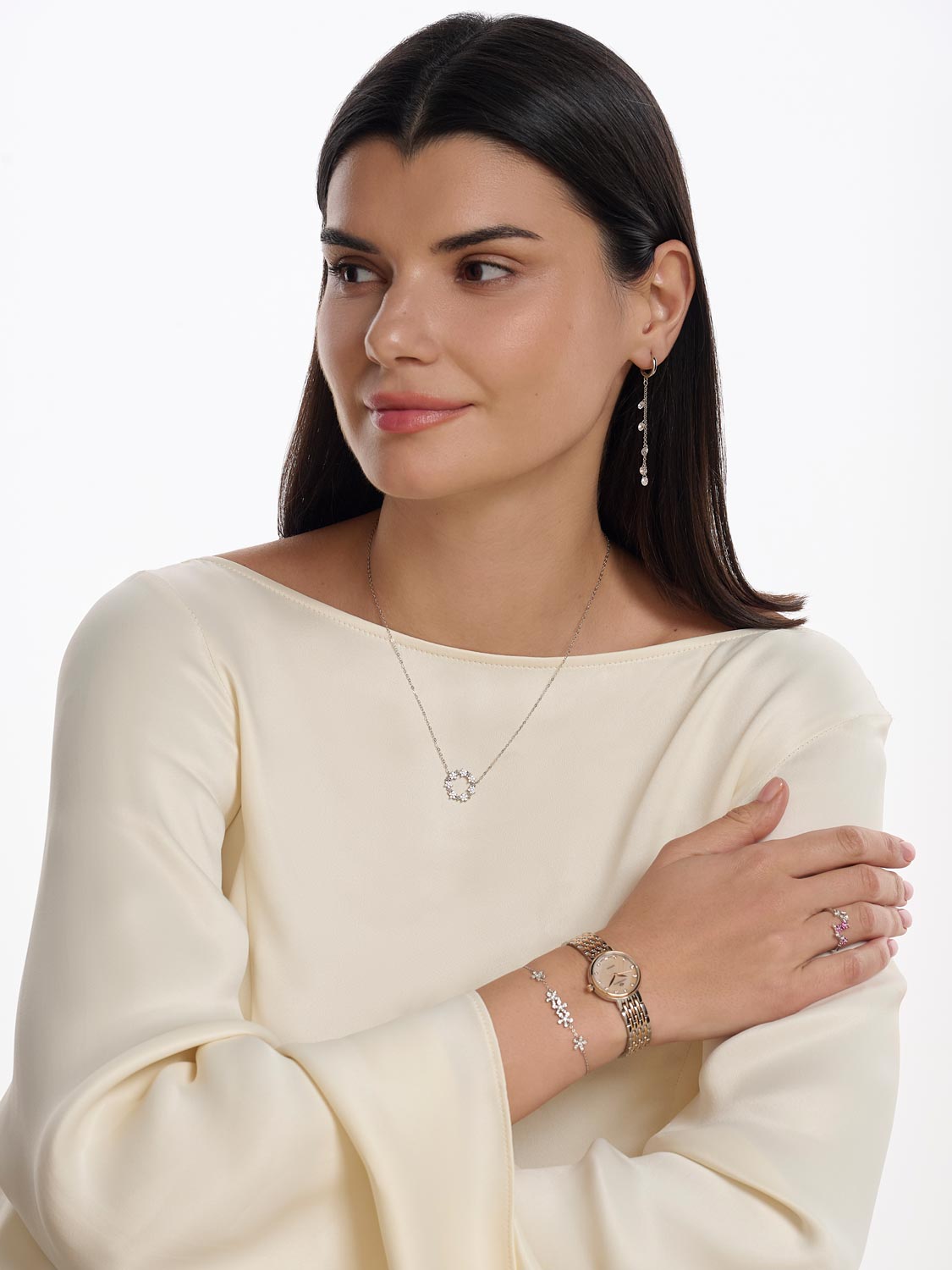 Ladies. Женские часы с круглым стальным корпусом. Функция индикации заряда (EOL). Перламутровый циферблат. Метки в виде точек. Стальной браслет с раскладывающейся застежкой.