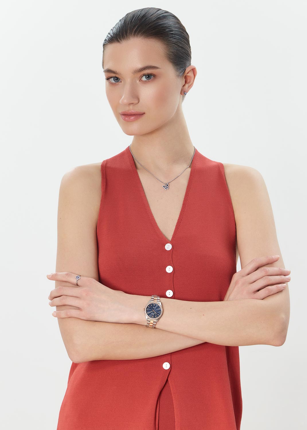 Элегантный аксессуар гармонично впишется в ваш повседневный стиль одежды. Женские наручные часы. Функция индикации заряда (EOL). Круглый стальной корпус. Безель инкрустирован кристаллами. Гильошированный циферблат с метками в виде штрихов и римской цифры XII. Рифленая заводная головка. Надежный стальной браслет.