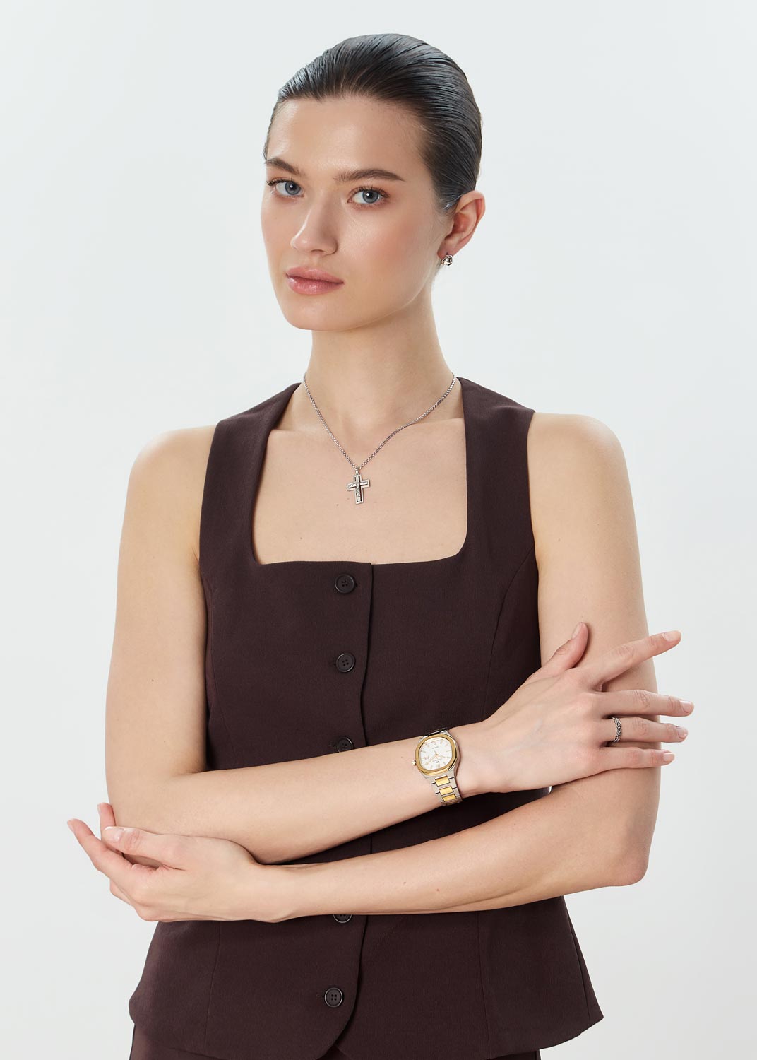 Элегантный аксессуар в лаконичном исполнении гармонично впишется в ваш повседневный стиль одежды. Женские наручные часы со стальным корпусом. Функция индикации заряда (EOL). Метки в виде штрихов. Окошко даты находится в положении 3 часа. Рифленая заводная головка. Надежный стальной браслет с раскладывающейся застежкой. Имеется мужской вариант модели 23501-GD312130.