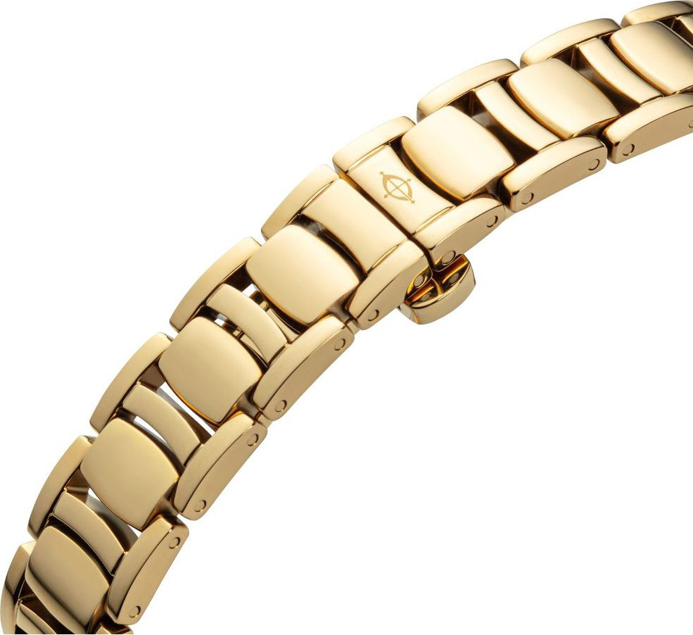 Женские часы с круглым стальным корпусом. Безель, циферблат и браслет украшены кристаллами. Метки в виде точек. Окошко даты в положении 3 часа. Рифленая заводная головка. Стальной браслет с раскладывающейся застежкой.