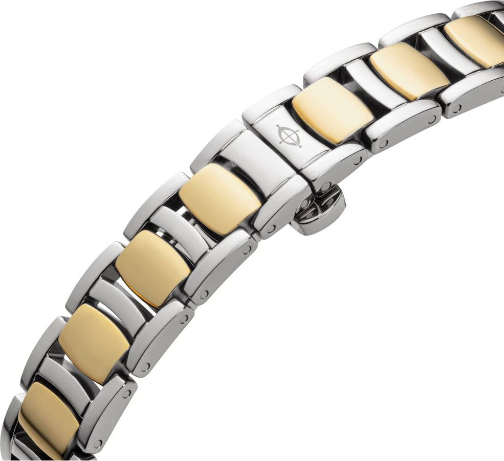 Женские часы с круглым стальным корпусом. Безель и браслет украшены кристаллами. Метки в виде штрихов. Окошко даты в положении 3 часа. Рифленая заводная головка. Стальной браслет с раскладывающейся застежкой.