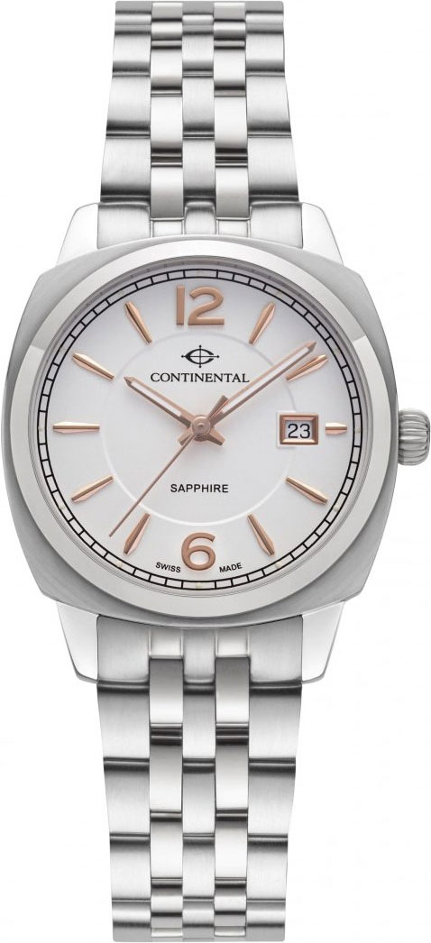 Женские наручные часы со стальным корпусом. Функция индикации заряда (EOL). Метки в виде штрихов и арабских цифр 6,12. Окошко даты в положении 3 часа. Рифленая заводная головка. Стальной браслет с раскладывающейся застежкой. Имеется мужской вариант модели 24451-GD101120.
