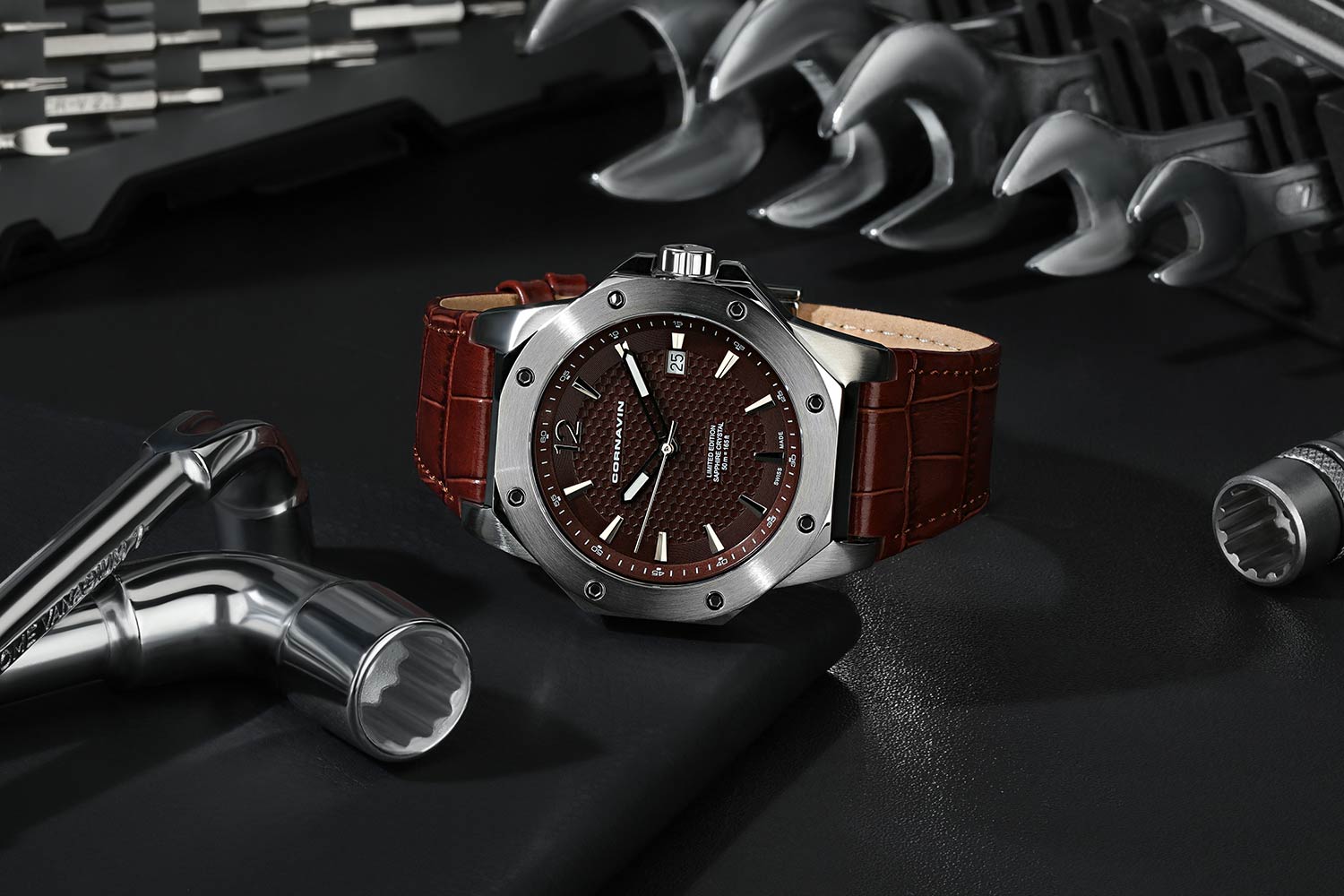 Современный дизайн этого швейцарского аксессуара станет идеальным завершением любого образа. Downtown 3-H. Лимитированная серия - 999 экземпляров. Круглый корпус изготовлен из нержавеющей стали с прочным сапфировым стеклом. Эффектный восьмигранный безель украшен стильными винтами. Циферблат декорирован узором сотовой структуры и логотипом Cornavin. Заостренные прямоугольные часовая и минутная стрелки покрыты фирменным люминесцентным составом Super-LumiNova, который светится в темноте. Метки в виде штрихов и арабской цифры 12. Окошко даты находится в положении 3 часа. Завинчивающаяся заводная головка с защитой. Завинчивающаяся задняя крышка. Удобный ремешок, изготовленный из натуральной телячьей кожи, с раскладывающейся застежкой.