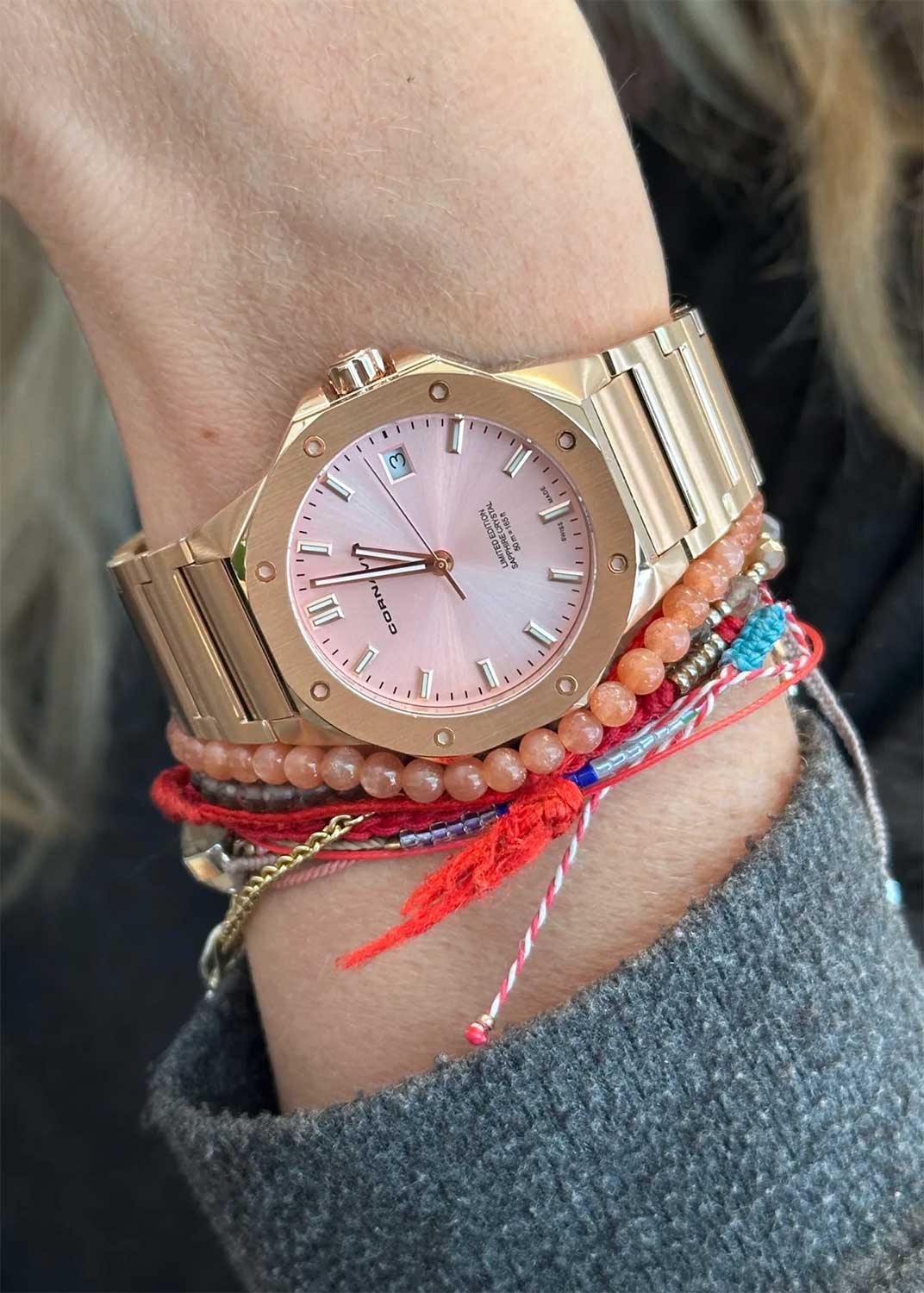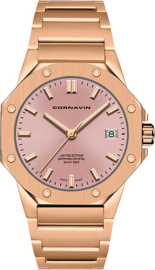 Циферблат с метками в виде штрихов выполнен по технологии Sunray (солнечные лучи) и декорирован логотипом Cornavin в положении 12 часов. Метки и стрелки с люминесцентным покрытием, которое светится в темноте после непродолжительной зарядки на свету.