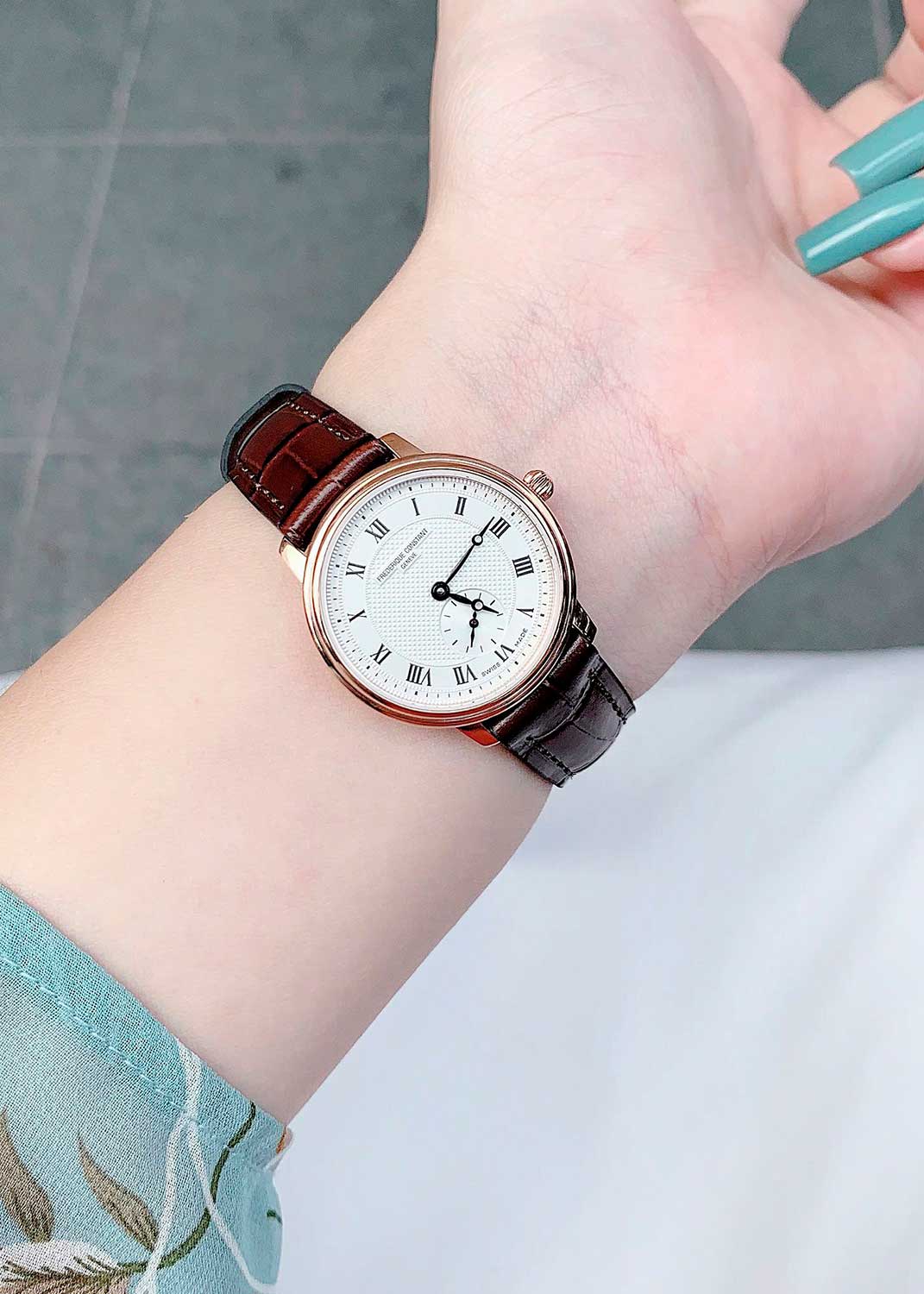 Метки в виде римских цифр. Винтажные стрелки в стиле Breguet. Секундная стрелка вынесена на отдельный циферблат. Рифленая заводная головка. Удобный кожаный ремешок с классической застежкой.