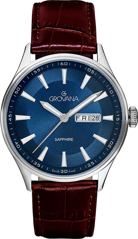 Метки и стрелки с люминесцентным покрытием, которое светится в темноте после непродолжительной зарядки на свету. Окошко даты и день недели находится в положении 3 часа. Сапфировое стекло. Рифленая заводная головка. Удобный кожаный ремешок.