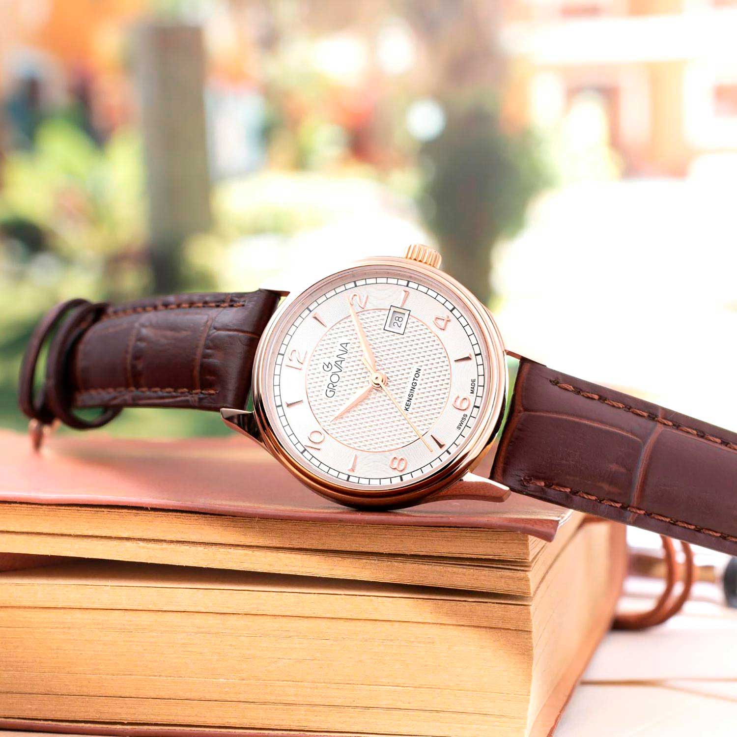 Накладные метки в виде арабских цифр и штрихов. Острые стрелки в стиле Alpha. Окошко даты находится в положении 3 часа. Рифленая заводная головка. Удобный кожаный ремешок.