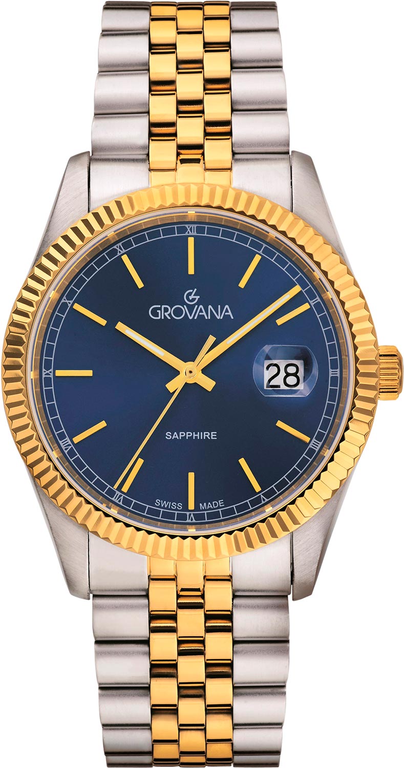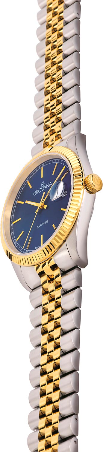Прямоугольные стрелки в стиле Baton с люминесцентным покрытием, которое светится в темноте после непродолжительной зарядки на свету. Окошко даты с увеличительным стеклом, находится в положении 3 часа. Рифленая заводная головка. Завинчивающаяся задняя крышка. Стальной браслет с раскладывающейся застежкой.