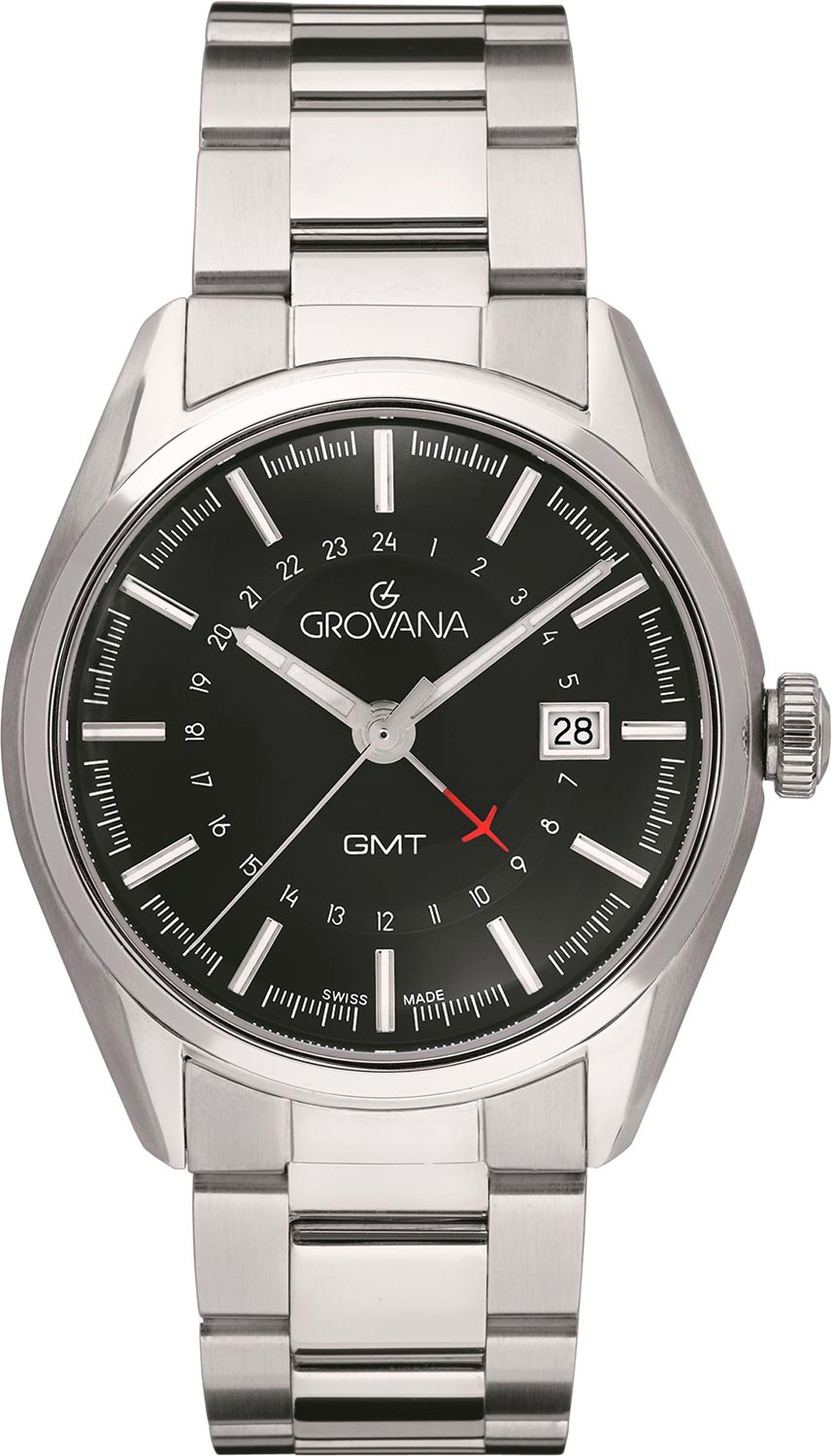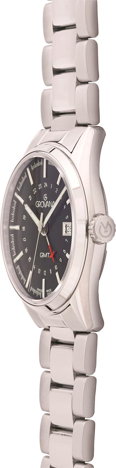 Мужские наручные кварцевые часы. Круглый стальной корпус с матовой и полированной отделкой. Второй часовой пояс в 24-х часовом формате времени отображается центральной стрелкой. Матовый циферблат. Накладные метки в виде штрихов. Заостренные прямоугольные стрелки в стиле Baton.