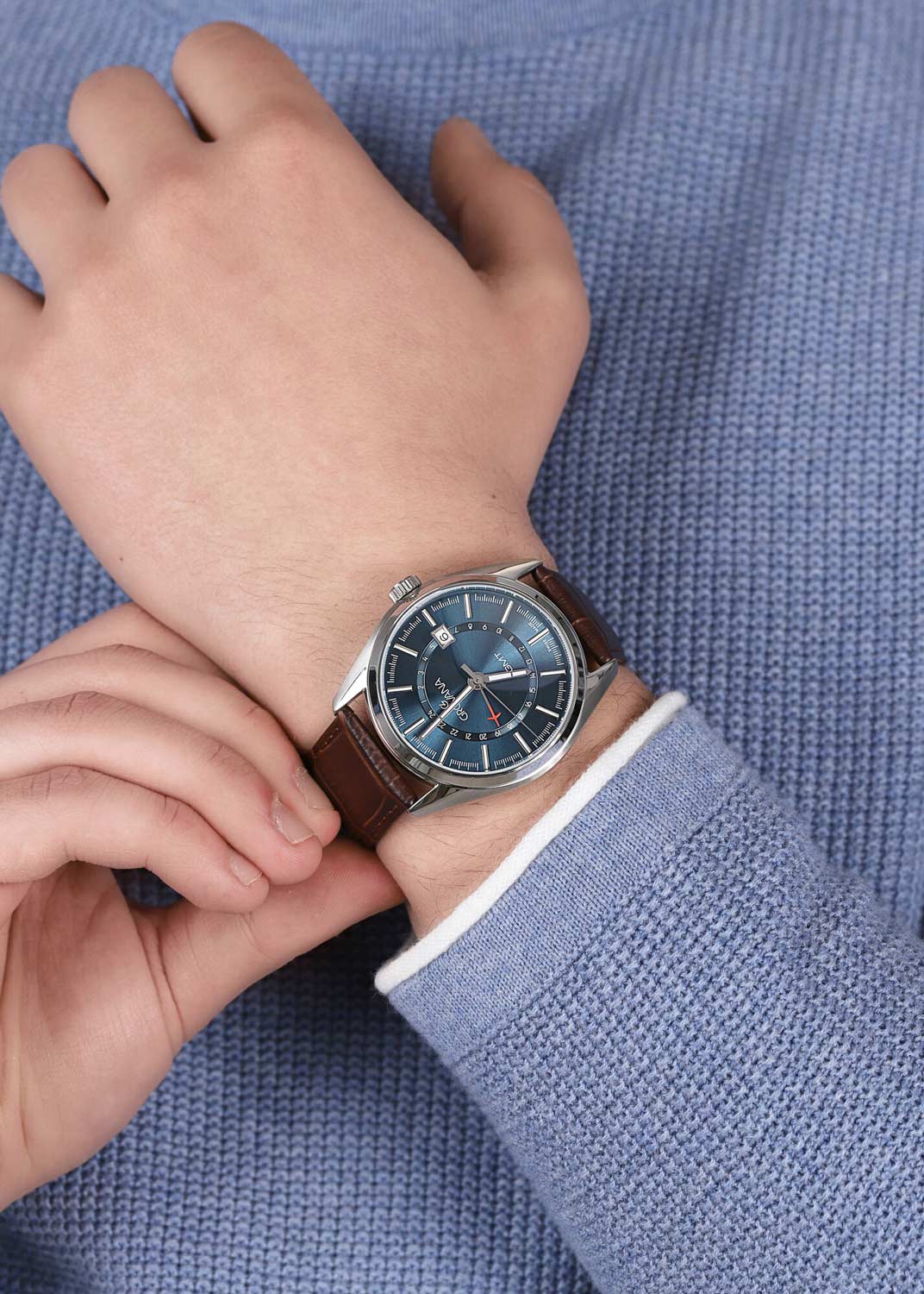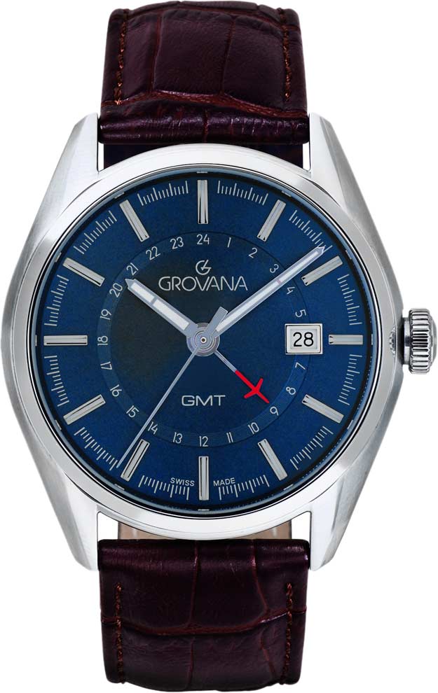 Мужские наручные часы. Круглый стальной корпус с матовой и полированной отделкой. Второй часовой пояс в 24-х часовом формате времени отображается центральной стрелкой. Матовый циферблат защищен прочным сапфировым стеклом. Накладные метки в виде штрихов. Заостренные прямоугольные стрелки в стиле Baton.
