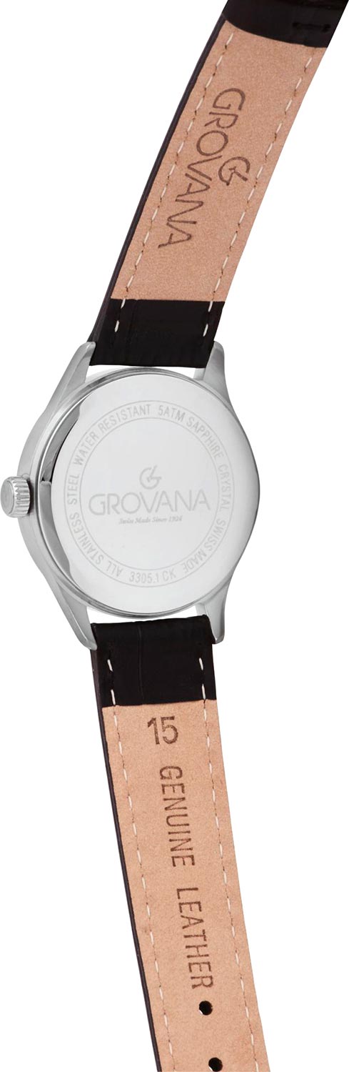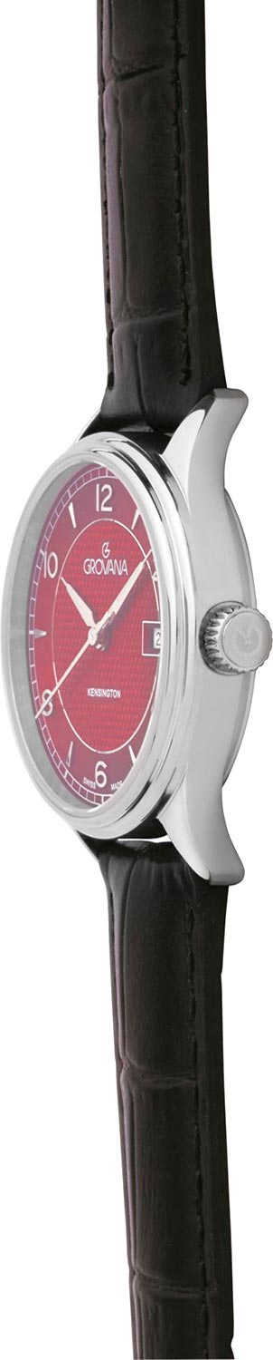 Накладные метки в виде штрихов и арабских цифр. Острые стрелки в стиле Alpha. Окошко даты находится в положении 3 часа. Рифленая заводная головка. Удобный кожаный ремешок.