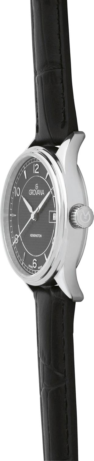 Накладные метки в виде штрихов и арабских цифр. Острые стрелки в стиле Alpha. Окошко даты находится в положении 3 часа. Рифленая заводная головка. Удобный кожаный ремешок.