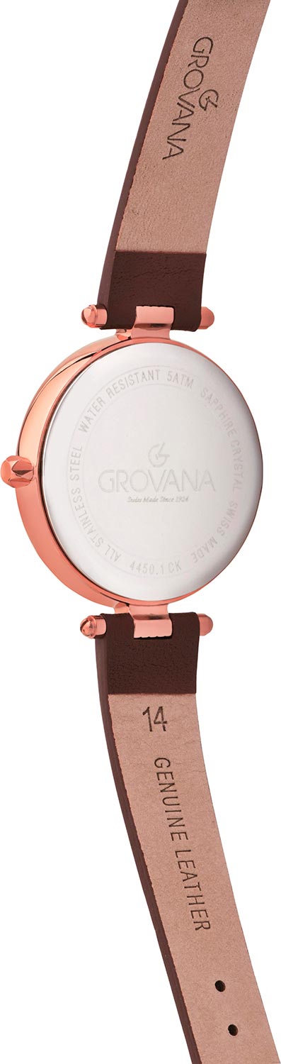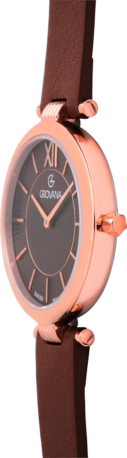 Женские наручные кварцевые часы. Круглый стальной корпус с полированной отделкой. Циферблат с узором в виде лучей выполнен по технологии Sunray (солнечные лучи). Накладные метки в виде штрихов и римской цифры XII. Прямоугольные стрелки в стиле Baton. Граненая заводная головка в форме конуса. Удобный кожаный ремешок.