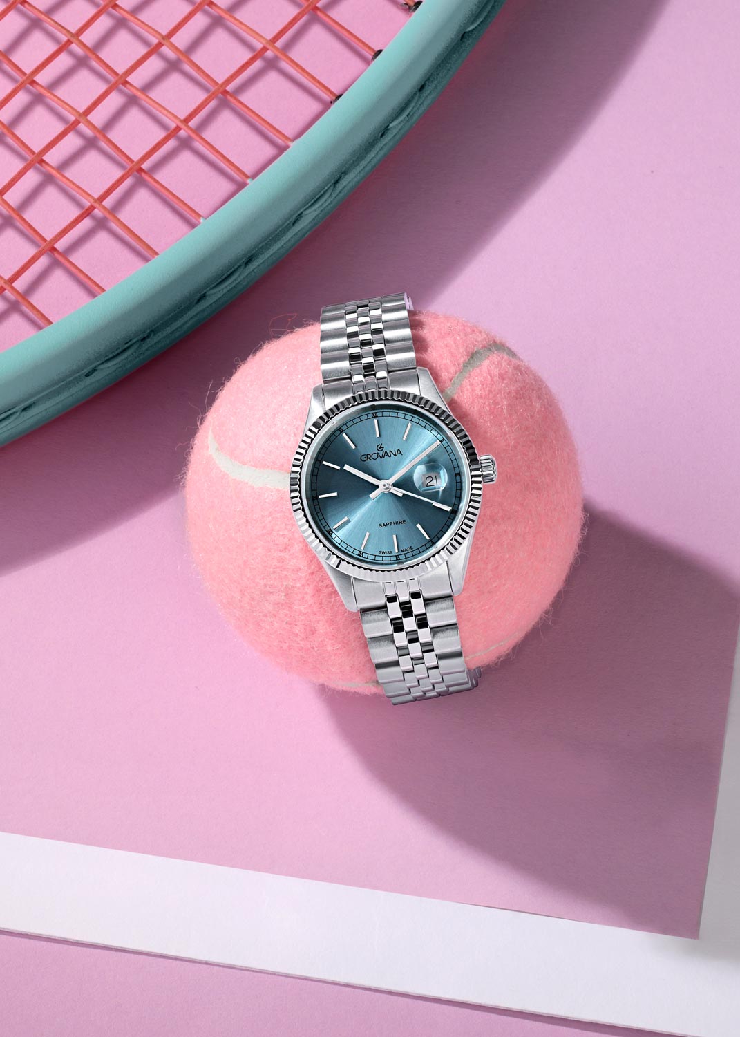 Прямоугольные стрелки в стиле Baton с люминесцентным покрытием, которое светится в темноте после непродолжительной зарядки на свету. Окошко даты с увеличительным стеклом находится в положении 3 часа. Рифленая заводная головка. Завинчивающаяся задняя крышка. Стальной браслет с раскладывающейся застежкой.