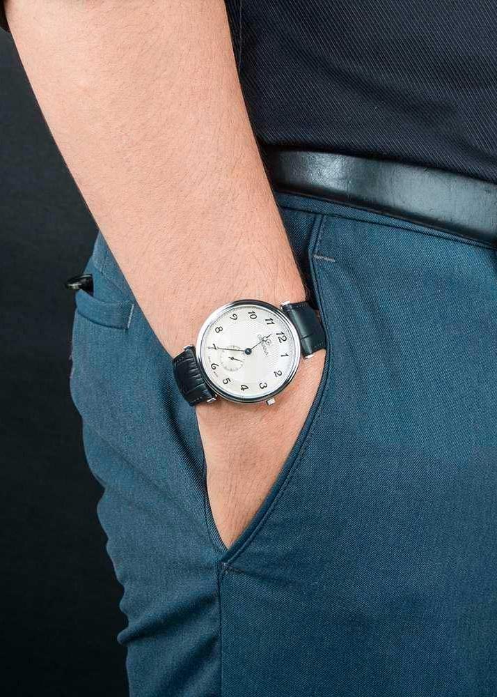 Наручные мужские классические часы. Круглый стальной корпус с двойным ободком. Гильошированный циферблат с арабскими цифрами. Стрелки в стиле Breguet.