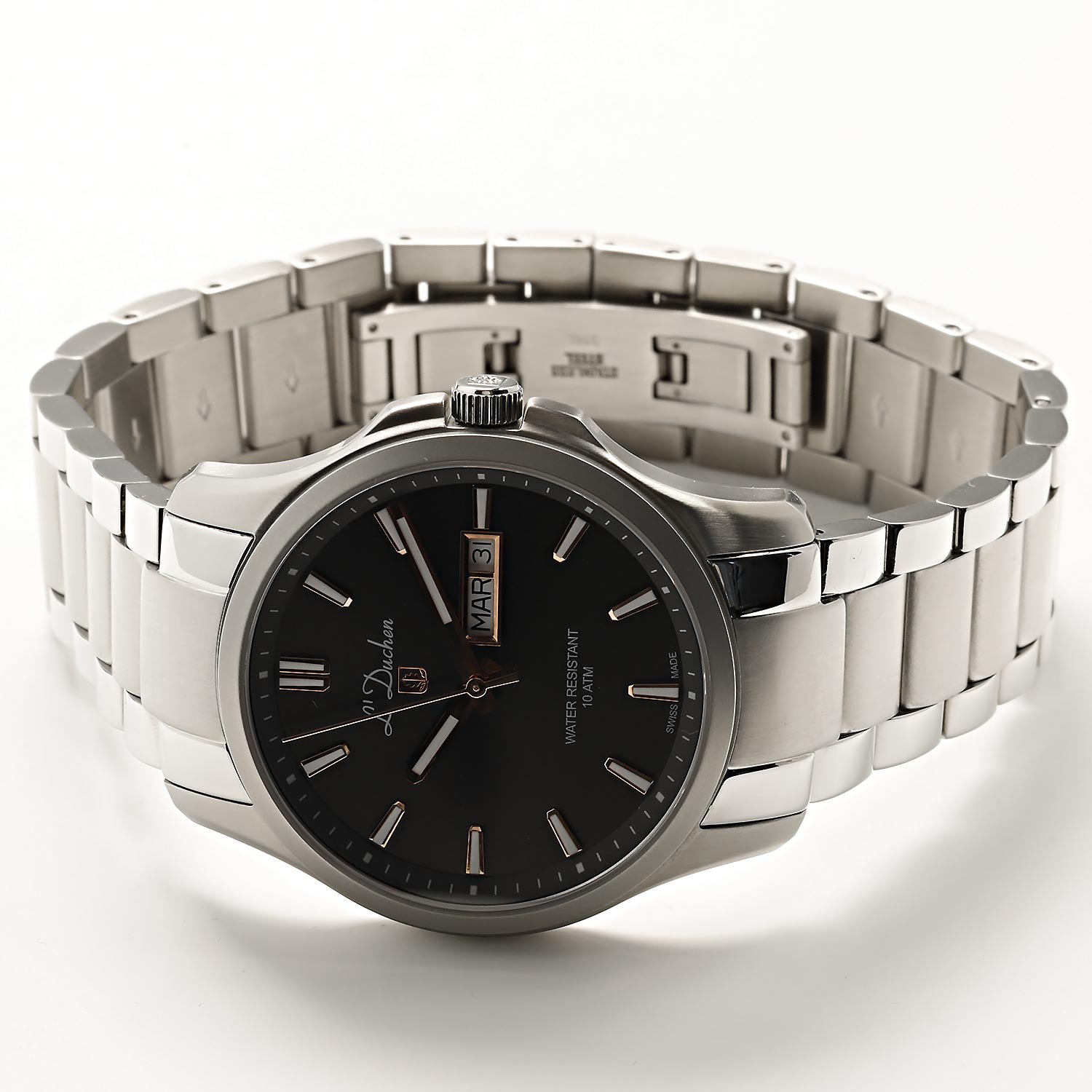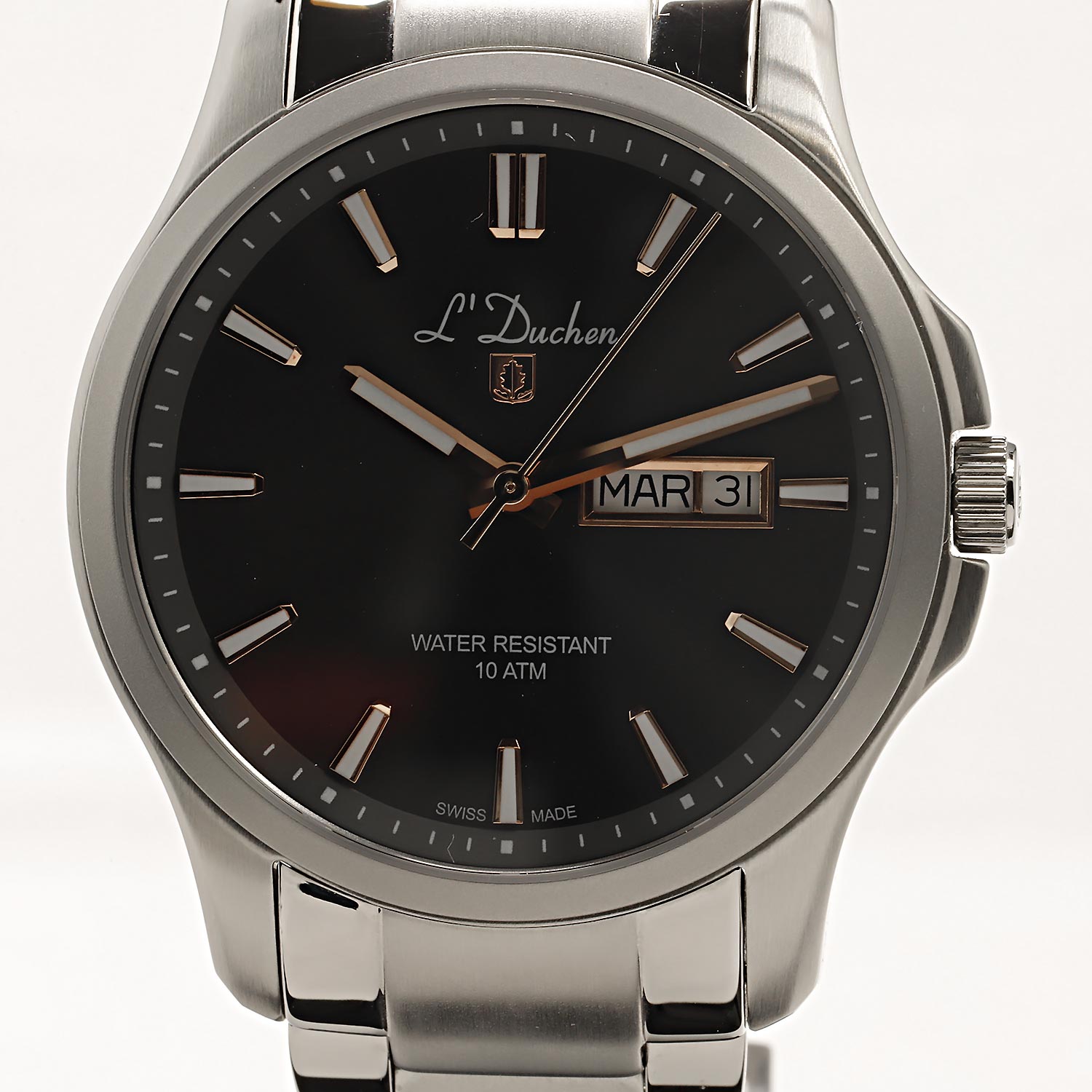 Часы с классическими чертами выгодно подчеркнут элегантный образ настоящего мужчины. Dynamique. Мужские часы с круглым стальным корпусом. Циферблат выполнен по технологии Sunray (солнечные лучи) и украшен фирменным логотипом L'Duchen в виде дубового листа – символа мудрости и долговечности. Метки в виде штрихов. Окошко даты и дня недели находится в положении 3 часа. Заводная головка с защитой. Браслет с раскладывающейся застежкой.