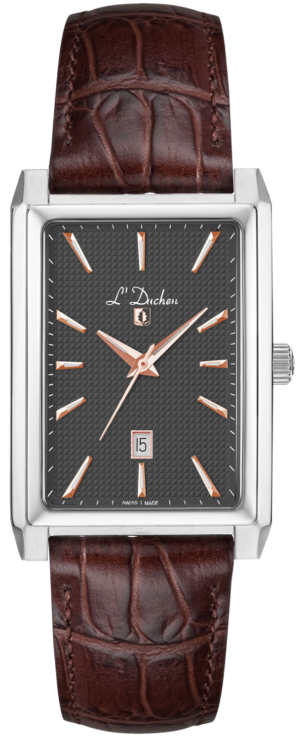 Прямоугольные мужские часы коллекции Adventure дизайнеры марки L'Duchen разработали в эргономической форме. Они удобно ложатся на руке и элегантно дополняют любой стиль одежды. Adventure. Циферблат украшен традиционным для швейцарских часов рисунком Clous de Paris («парижские гвозди»). Метки в виде штрихов. Окошко даты находится в положении 6 часов и украшено стальной окантовкой. Рифленая заводная головка. Удобный и надежный кожаный ремешок.