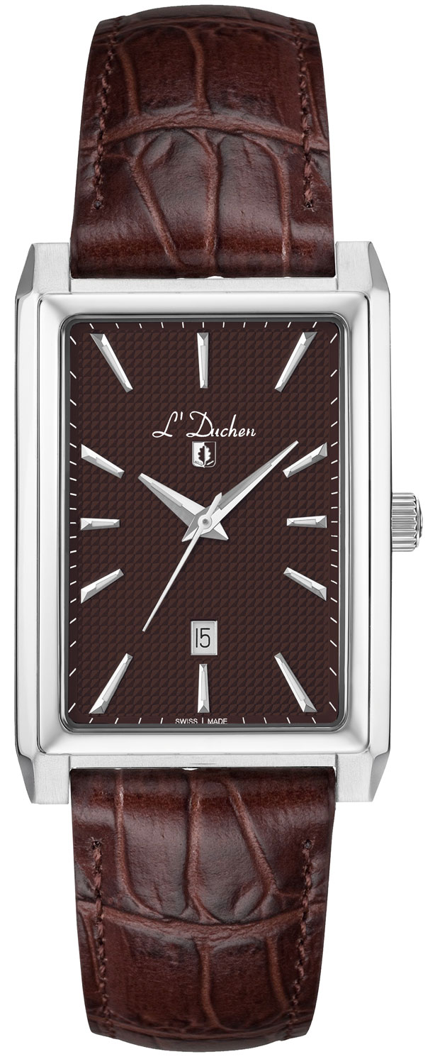 Прямоугольные мужские часы коллекции Adventure дизайнеры марки L'Duchen разработали в эргономической форме. Они удобно ложатся на руке и элегантно дополняют любой стиль одежды. Adventure. Циферблат украшен традиционным для швейцарских часов рисунком Clous de Paris («парижские гвозди»). Метки в виде штрихов. Окошко даты находится в положении 6 часов и украшено стальной окантовкой. Рифленая заводная головка. Удобный и надежный кожаный ремешок.