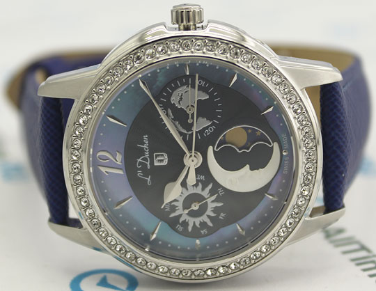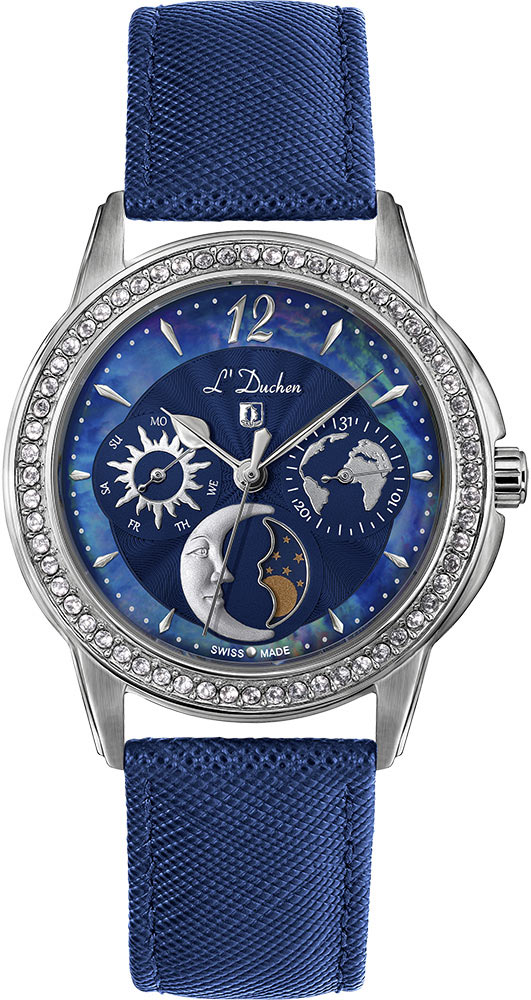 Оригинальный дизайн часов идеально подчеркнет ваш повседневный образ и придаст ему очарования. Celeste. Женские часы с круглым корпусом. Перламутровый циферблат украшен фирменным логотипом L'Duchen в виде дубового листа – символа мудрости и долговечности. Метки в виде штрихов и арабской цифры 12. Число и день недели вынесены на отдельные циферблаты. Заводная головка с защитой. Ремешок с раскладывающейся застежкой.