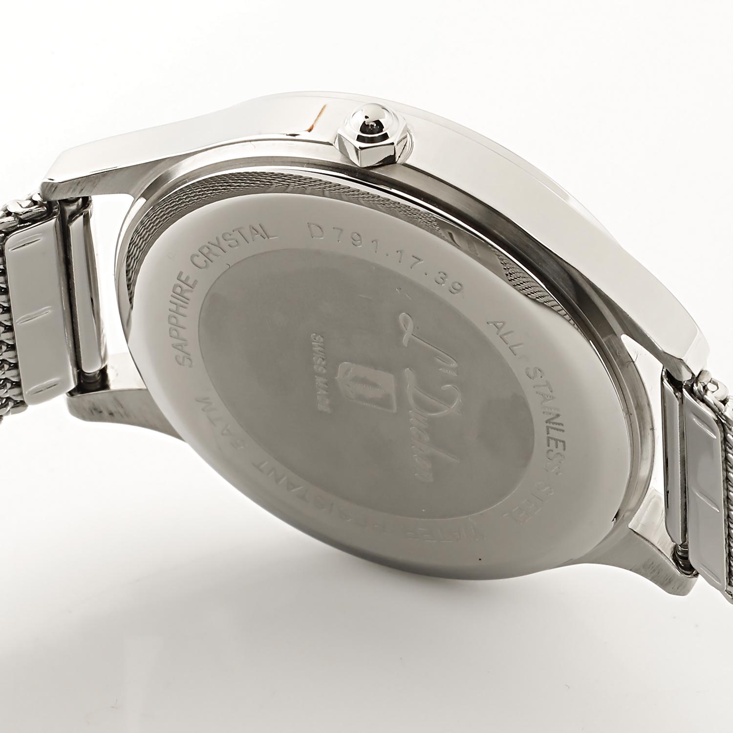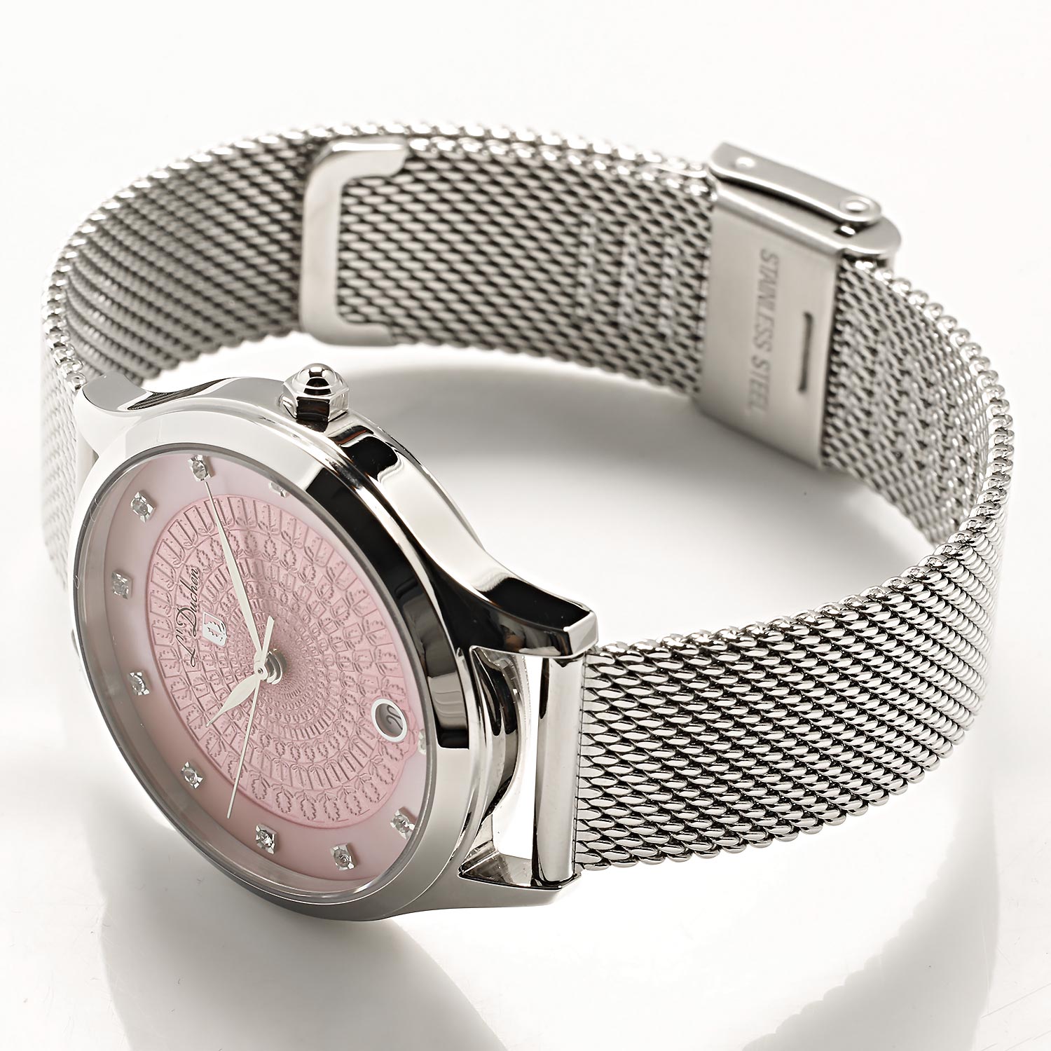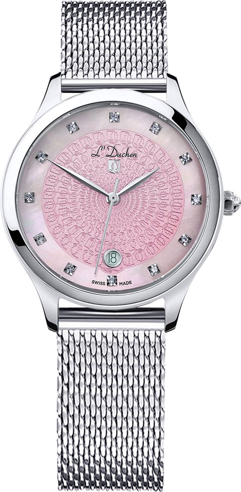 Циферблат часов серии Grace притягивает взгляд затейливым рисунком из стилизованных дубовых листьев - логотипом бренда L'Duchen - в центральной его части и вставкой из натурального перламутра, дополненной блеском фианитов. Изящная модель на каждый день и для выхода в свет. Grace. Швейцарские кварцевые наручные часы. Круглый стальной корпус c полированной поверхностью. Узкие листовидные стрелки в стиле Feuille. Метки в виде точек. Окошко даты находится в положении 6 часов. Граненая заводная головка. Удобный и надежный стальной браслет миланского плетения с регулируемой застежкой.