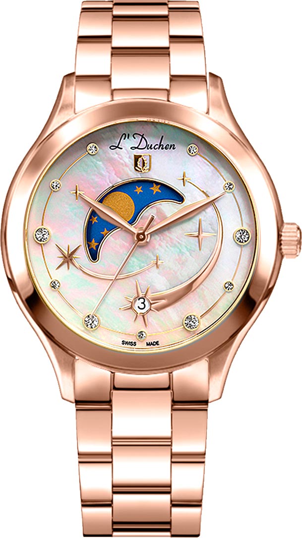 Женские кварцевые часы со швейцарским механизмом Perseides. Круглый корпус из прочной нержавеющей стали с чередованием полированных и матовых элементов. Уникальный циферблат из натурального перламутра, рисунок которого создан самой природой, украшен фирменным логотипом L'Duchen в виде дубового листа — символа мудрости и долговечности.