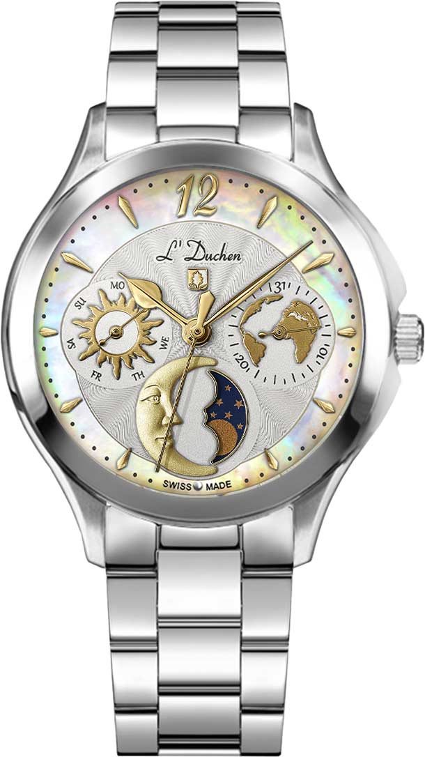 Выразительный аксессуар, дополненный необходимыми функциями, станет прекрасным продолжением стильного образа. Женские часы с круглым стальным корпусом Celeste. Гильошированный циферблат с перламутровой вставкой украшен фирменным логотипом L'Duchen в виде дубового листа – символа мудрости и долговечности. Метки в виде штрихов и арабской цифры 12. Число и день недели вынесены на отдельные циферблаты. Указатель фаз Луны находится в положении 6 часов. Рифленая заводная головка с защитой. Браслет с раскладывающейся застежкой.