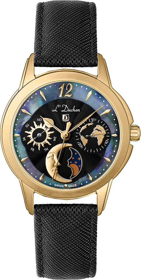 Женские часы Petit Celeste с круглым стальным корпусом. Гильошированный циферблат с перламутровой вставкой украшен фирменным логотипом L'Duchen в виде дубового листа – символа мудрости и долговечности. Метки в виде штрихов и арабской цифры 12. Число и день недели вынесены на отдельные циферблаты. Указатель фаз Луны находится в положении 6 часов. Рифленая заводная головка с защитой. Удобный кожаный ремешок с раскладывающейся застежкой.