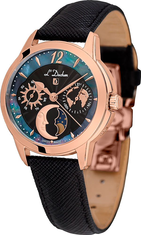 Женские часы Petit Celeste с круглым стальным корпусом. Гильошированный циферблат с перламутровой вставкой украшен фирменным логотипом L'Duchen в виде дубового листа – символа мудрости и долговечности. Метки в виде штрихов и арабской цифры 12. Число и день недели вынесены на отдельные циферблаты. Указатель фаз Луны находится в положении 6 часов. Рифленая заводная головка с защитой. Удобный кожаный ремешок с раскладывающейся застежкой.