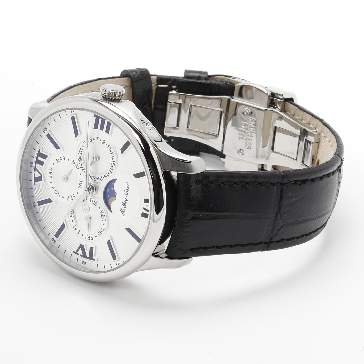 Часы со строгим дизайном и функциями числа, дня недели, месяца и фаз Луны станут отличным вариантом на каждый день. Ваш безупречный стиль! Edmond Moon. Мужские часы с круглым корпусом. Число, день недели и месяц отображаются на отдельных циферблатах. Рифленая заводная головка. Кожаный ремешок с застежкой-бабочкой.