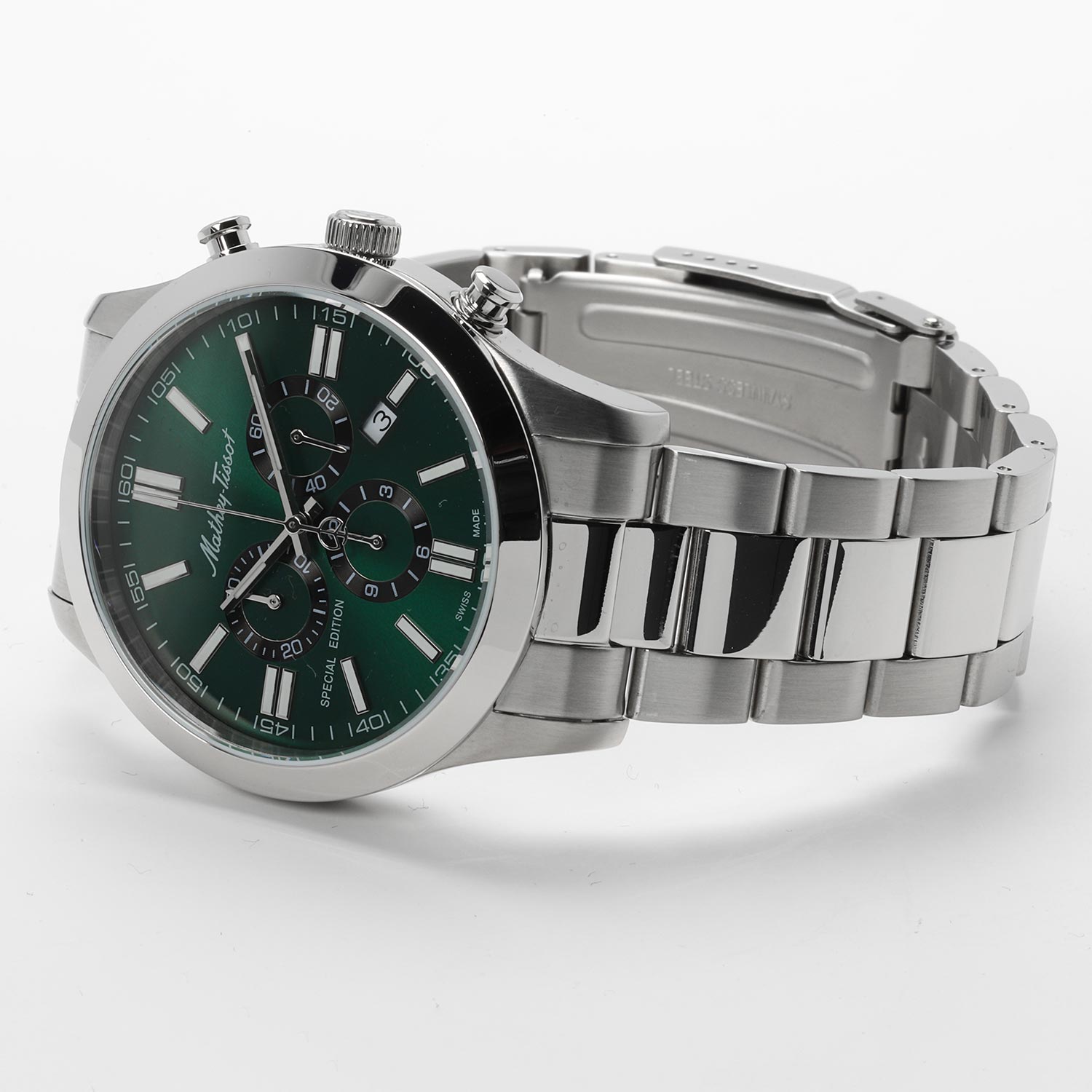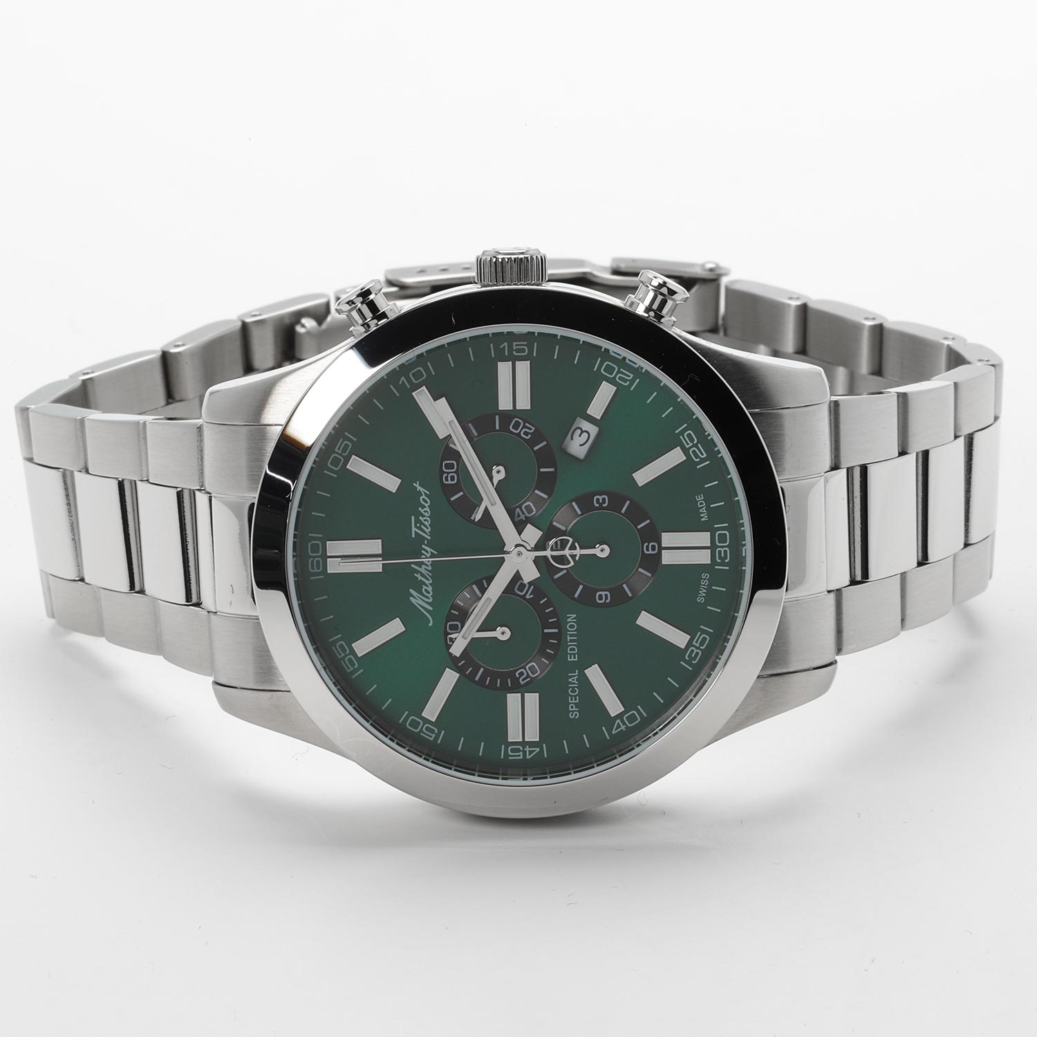 Часы со стильным дизайном станут любимым аксессуаром для настоящих мужчин. Mathy I Jumbo Chrono. Специальный выпуск. Часы-хронограф с секундомером. Циферблат с метками в виде штрихов выполнен по технологии Sunray (солнечные лучи). Рифленая заводная головка. Браслет с раскладывающейся застежкой.