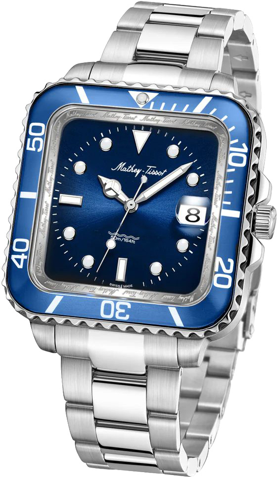 Мужские кварцевые часы Mathy Vintage Square с квадратным корпусом из высококачественной нержавеющей стали. Рифленый безель синего цвета с минутными отметками. Циферблат с метками в виде точек и штрихов и минутными метками по внешнему краю выполнен по технологии Sunray (солнечные лучи) и защищен устойчивым к царапинам сапфировым стеклом.