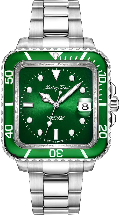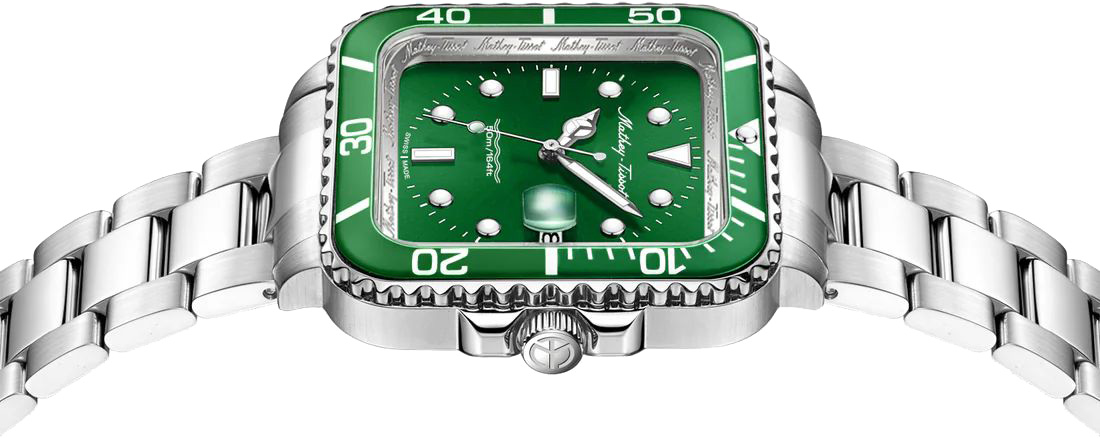Мужские кварцевые часы Mathy Vintage Square с квадратным корпусом из высококачественной нержавеющей стали. Рифленый безель зеленого цвета с минутными отметками. Циферблат с метками в виде точек и штрихов и минутными метками по внешнему краю выполнен по технологии Sunray (солнечные лучи) и защищен устойчивым к царапинам сапфировым стеклом.