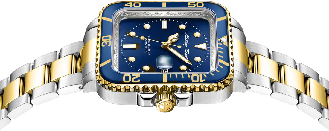 Метки и стрелки с люминесцентным покрытием SuperLumiNova, которое светится в темноте после непродолжительной зарядки на свету. Окошко даты с увеличительным стеклом находится в положении 3 часа. Завинчивающаяся заводная головка с защитой. Стальной браслет с частичным PVD покрытием цвета желтого золота и раскладывающейся застежкой с фиксатором.