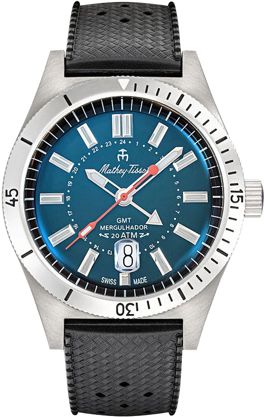 Мужские кварцевые часы Mergulhador GMT с круглым корпусом из высококачественной нержавеющей стали. Рифленый безель с минутными отметками вращается в одном направлении. Второй часовой пояс в 24-х часовом формате времени отображается центральной стрелкой. Циферблат с метками в виде штрихов и минутными метками по внешнему краю защищен минеральным стеклом с устойчивым к царапинам сапфировым покрытием.