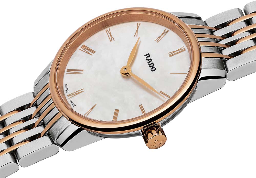 Женские наручные часы Coupole Classic. Круглый стальной корпус. Перламутровый циферблат с метками в виде римских цифр. Листовидные стрелки в стиле Feuille. Рифленая заводная головка. Надежный стальной браслет с раскладывающейся застежкой.