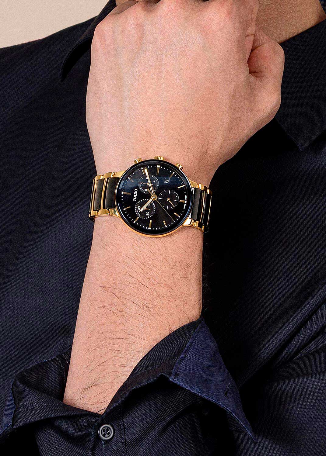 Окошко даты находится в положении 4 часа. Изогнутое сапфировое стекло с двусторонним антибликовым покрытием. Рифленая заводная головка. Надежный стальной браслет с керамическими вставками. Раскладывающаяся застежка.