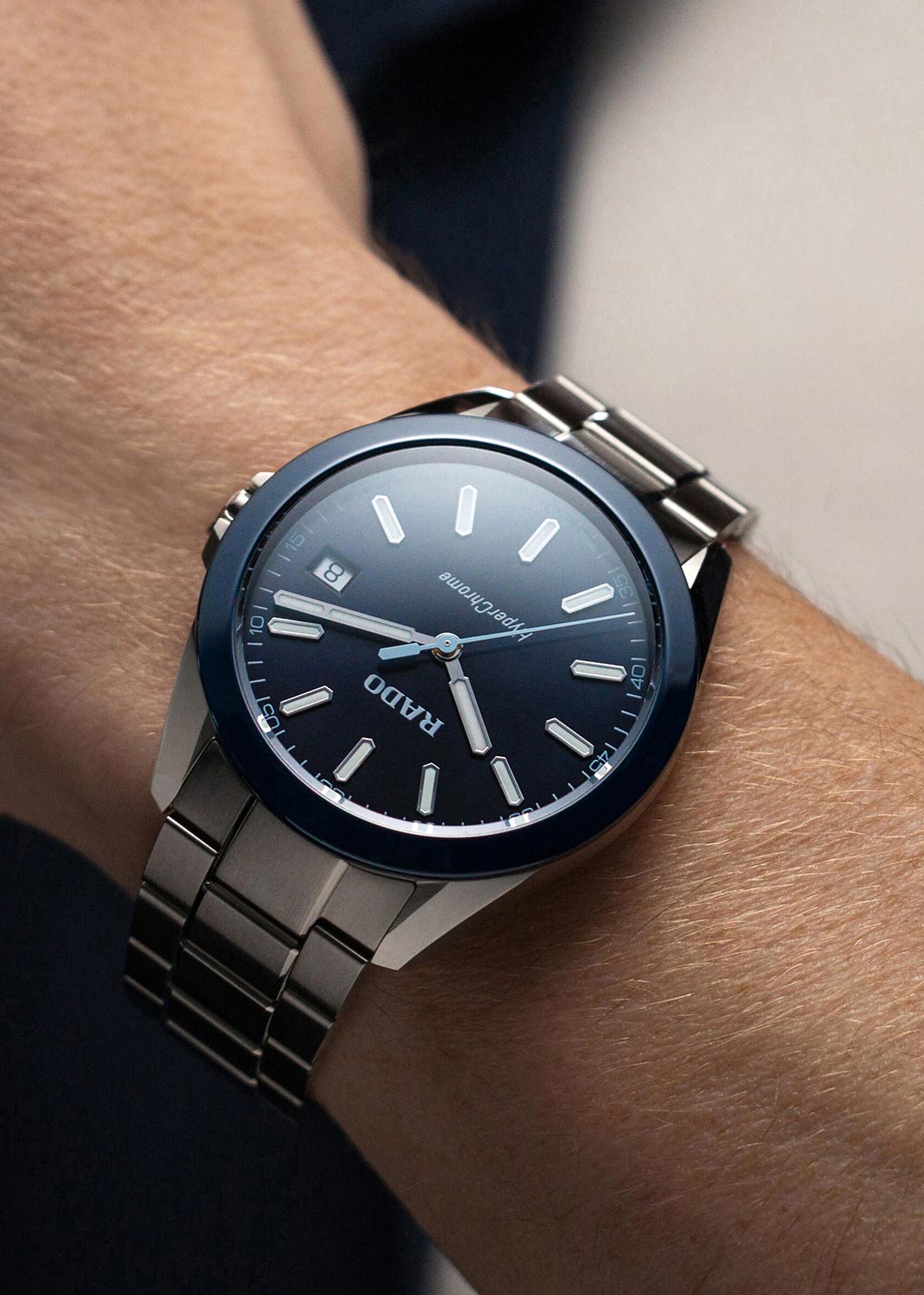 Накладные метки в виде штрихов. Заостренные прямоугольные стрелки в стиле Baton. Метки и стрелки с люминесцентным покрытием, которое светится в темноте после непродолжительной зарядки на свету. Ночью индекс двенадцати часов и минутная стрелка светятся зеленым, а остальные индексы и часовая стрелка – синим, обеспечивая быстрое и интуитивное считывание времени при любом освещении.