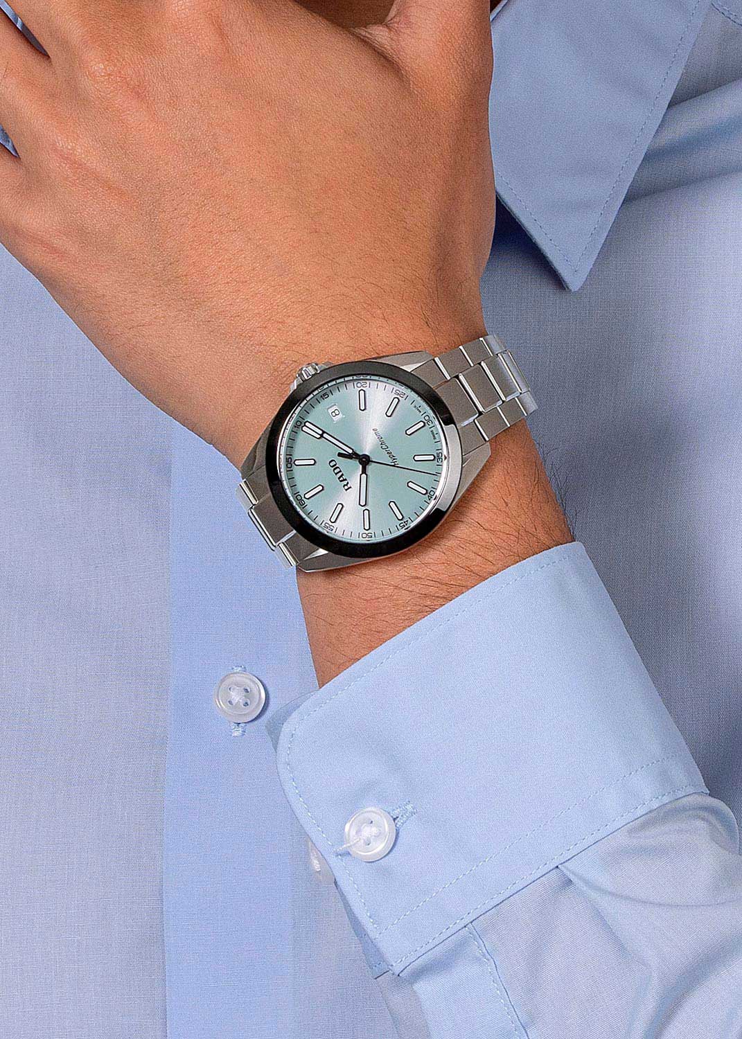 Накладные метки в виде штрихов. Заостренные прямоугольные стрелки в стиле Baton. Метки и стрелки с люминесцентным покрытием, которое светится в темноте после непродолжительной зарядки на свету. Ночью индекс двенадцати часов и минутная стрелка светятся зеленым, а остальные индексы и часовая стрелка – синим, обеспечивая быстрое и интуитивное считывание времени при любом освещении.