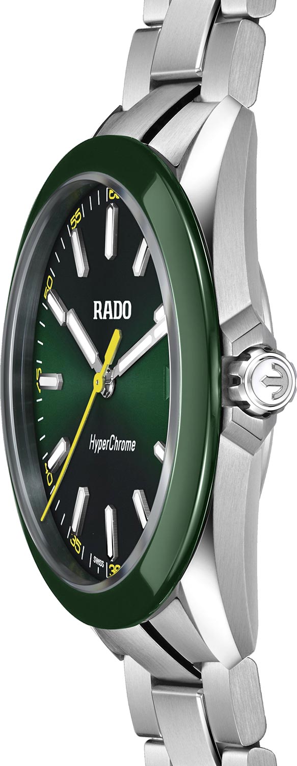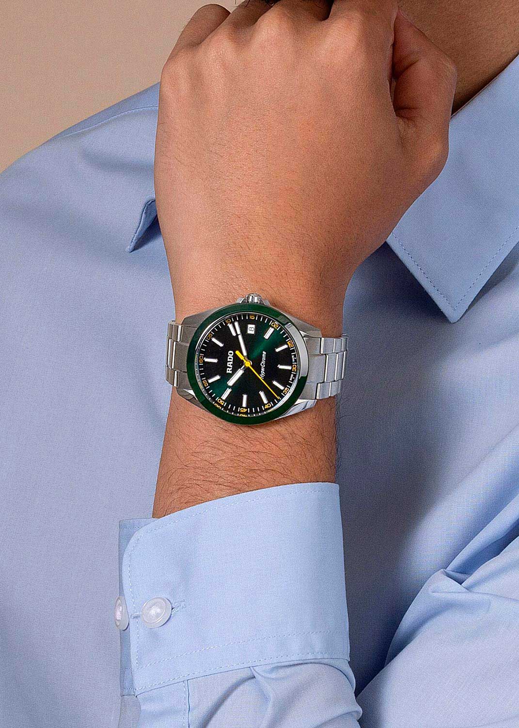 Накладные метки в виде штрихов. Заостренные прямоугольные стрелки в стиле Baton. Метки и стрелки с люминесцентным покрытием, которое светится в темноте после непродолжительной зарядки на свету. Ночью индекс двенадцати часов и минутная стрелка светятся зеленым, а остальные индексы и часовая стрелка – синим, обеспечивая быстрое и интуитивное считывание времени при любом освещении.