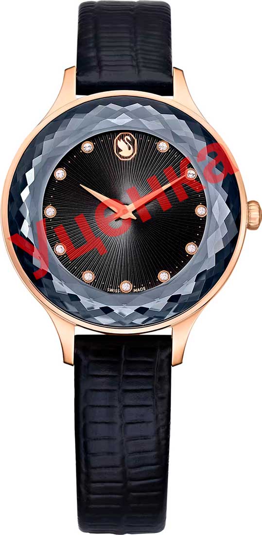 Женские кварцевые часы Octea Nova. Стальной круглый корпус с розовым PVD покрытием. Безель и циферблат изготовлены из цельного 72-гранного сапфирового стекла. Гильошированный циферблат черного цвета украшен кристаллами в положении меток и изображением лебедя Swarovski в положении 12 часов. Клиновидные стрелки в стиле Dauphine. Секундная стрелка отсутствует. Рифленая заводная головка. Ремешок из натуральной итальянской телячьей кожи черного цвета с тиснением под кожу ящерицы. Классическая застежка с логотипом Swarovski.