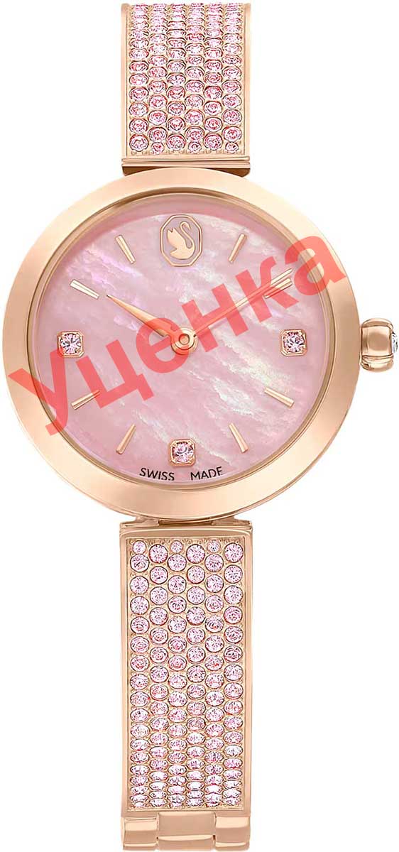 Женские кварцевые часы. Круглый стальной корпус с PVD покрытием оттенка розового золота. Под минеральным стеклом открывается перламутровый циферблат с логотипом Swarovski в виде лебедя в положении 12 часов. Метки в виде штрихов и точек из кристаллов в положениях 3,6 и 9 часов. Секундная стрелка отсутствует. Заводная головка украшена кристаллом круглой огранки. Стальной браслет с розовым PVD покрытием декорирован 210 розовыми кристаллами Swarovski, создающими изысканный мерцающий эффект. Ювелирная застежка.