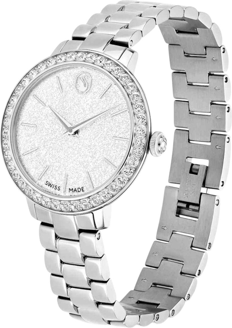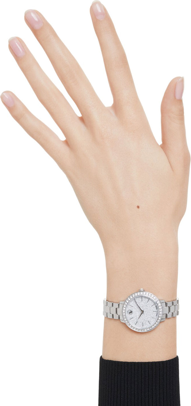 Метки в виде штрихов. Клиновидные стрелки в стиле Dauphine. Секундная стрелка отсутствует. Заводная головка украшена кристаллом круглой огранки. Стальной браслет с ювелирной застежкой.