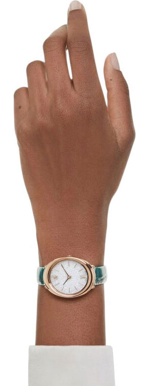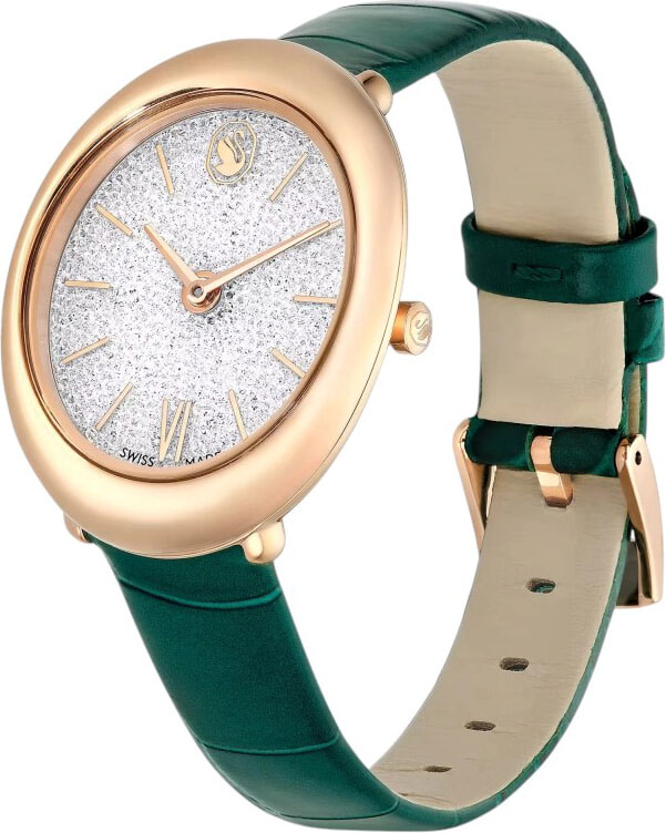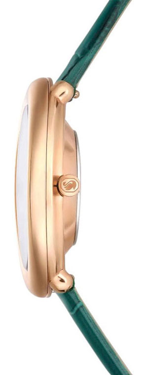 Женские наручные часы Imber. Овальный корпус из нержавеющей стали с розовым PVD покрытием. Циферблат украшен прозрачными кристаллами. Метки в виде штрихов, римской цифры 6 и логотипом Swarovski в виде лебедя в положении 12 часов. Кожаный зеленый ремешок с тиснением под кожу крокодила. Классическая застежка.