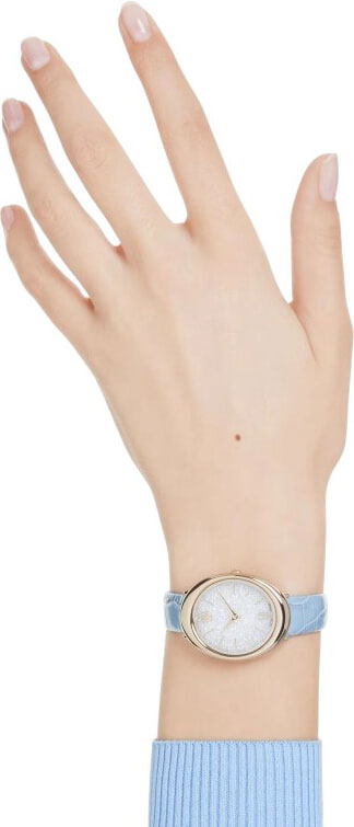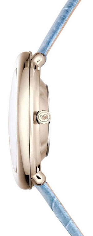 Женские наручные часы Imber. Овальный корпус из нержавеющей стали с PVD покрытием цвета шампань. Циферблат украшен прозрачными кристаллами. Метки в виде штрихов, римской цифры 6 и логотипом Swarovski в виде лебедя в положении 12 часов. Кожаный голубой ремешок с тиснением под кожу крокодила. Классическая застежка.
