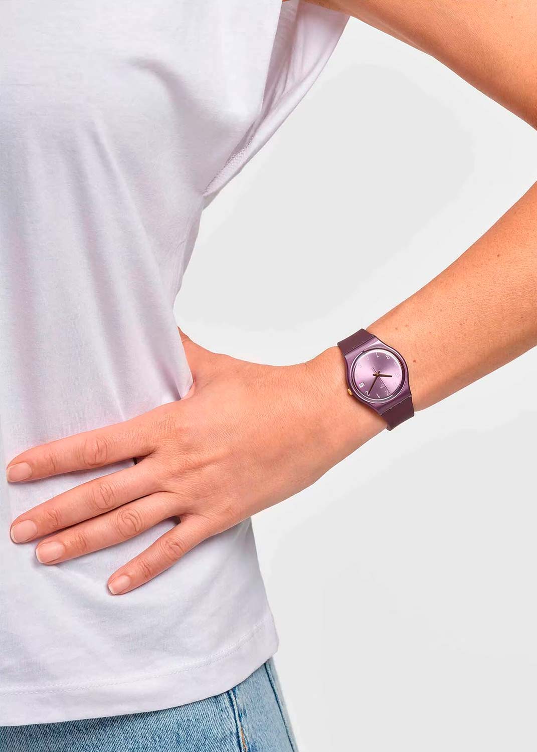 Сдержанный дизайн часов станет завершающим штрихом в вашем повседневном образе. Унисекс часы Pearlypurple. Круглый корпус из пластика. Метки в виде арабских цифр. Окошко даты в положении 6 часов. Стекло из многослойного акрила. Силиконовый ремешок.