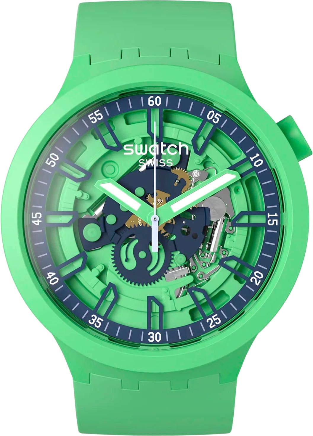 Наручные скелетонизированные унисекс часы Fresh Squeeze. Круглый корпус из матового пластика. Трехуровневый скелетонизированный циферблат. Метки в виде штрихов. Прямоугольные стрелки с люминесцентным эффектом Swatch Glow. Стекло из многослойного акрила. Заводная головка находится в положении 2 часа. Силиконовый ремешок с классической застежкой из алюминия.